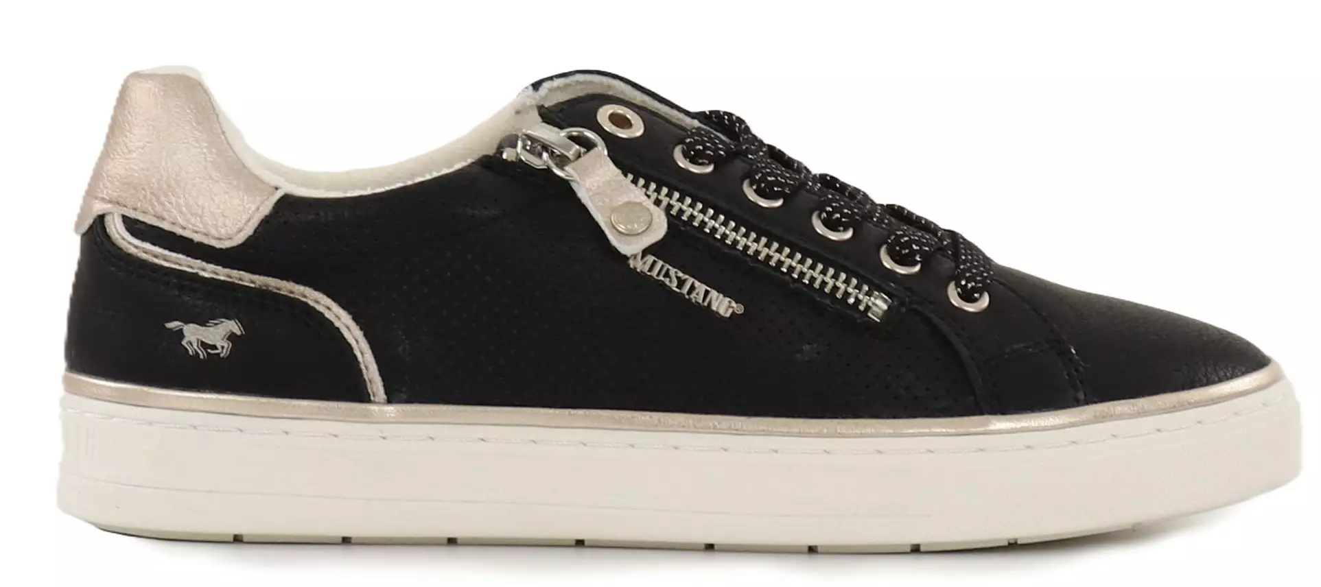 Niedrig geschnittene Mustang Sneakers mit Gummisohle und goldfarbenen Akzenten.