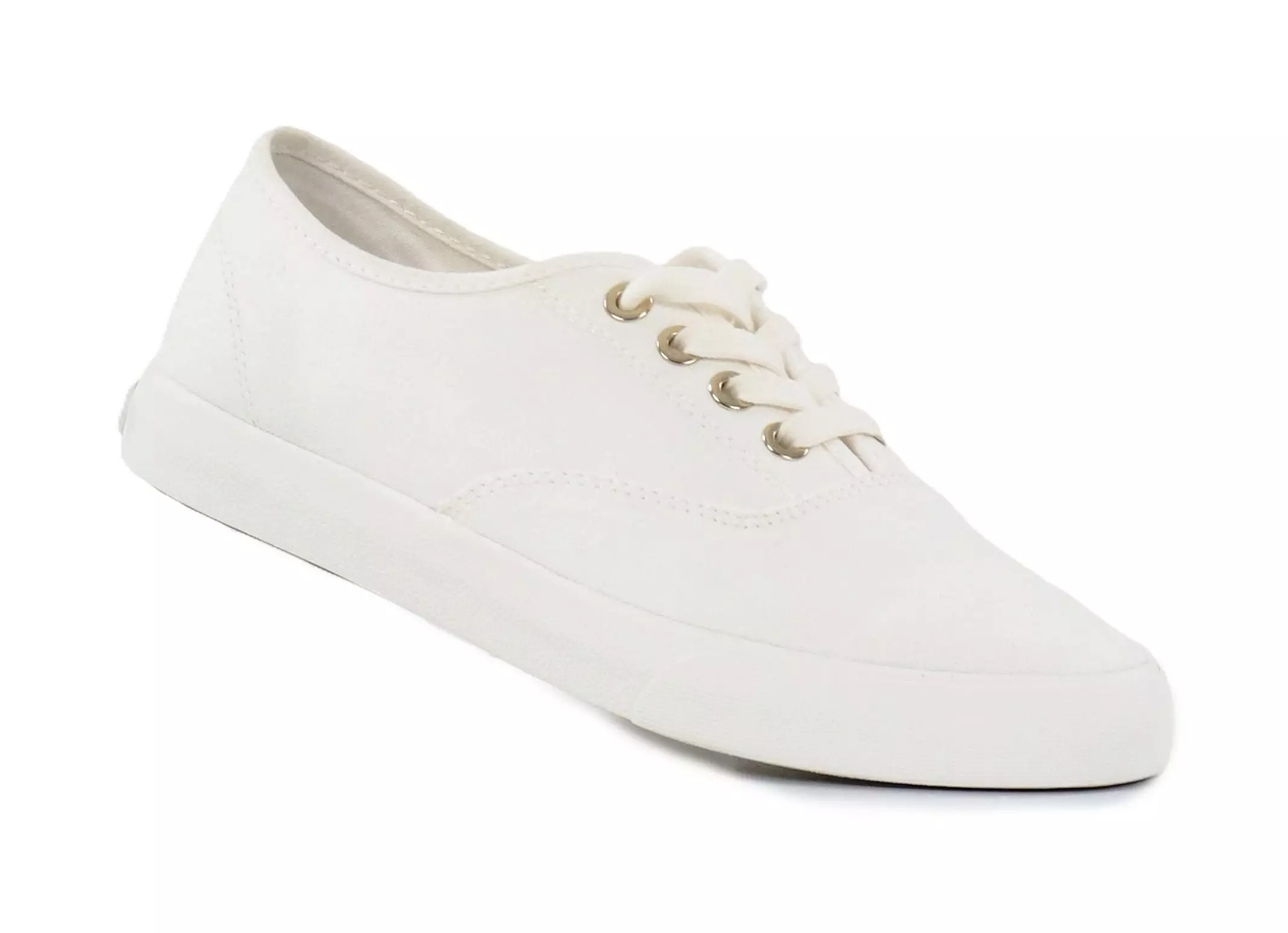 Einfacher weißer Textil-Sneaker mit goldenen Schnürösen. Vegane Materialien machen sie zu einer verantwortungsvollen und bequemen Wahl für den Alltag!