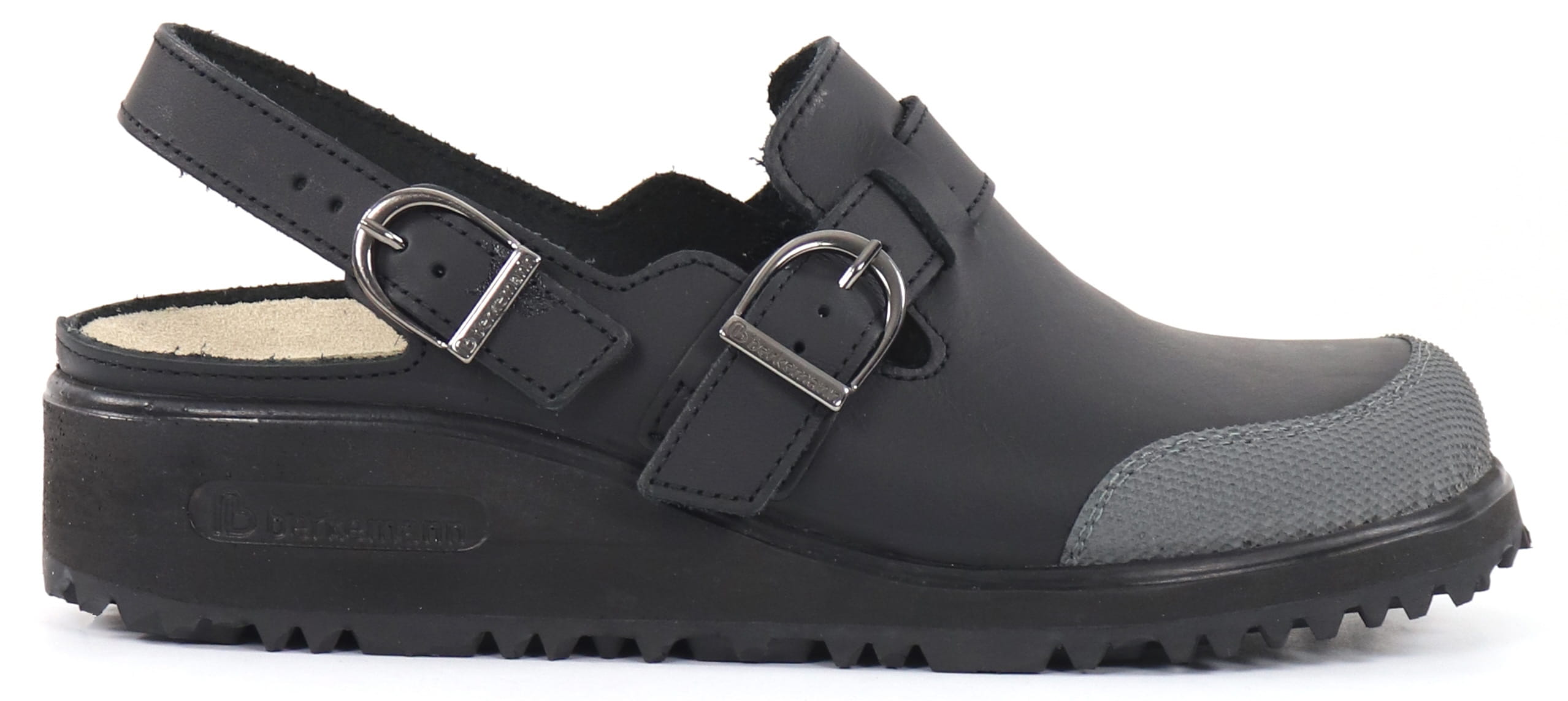 Arbeitsschuhe mit geschlossenem Fußteil und verstellbarem Schnallenverschluss.