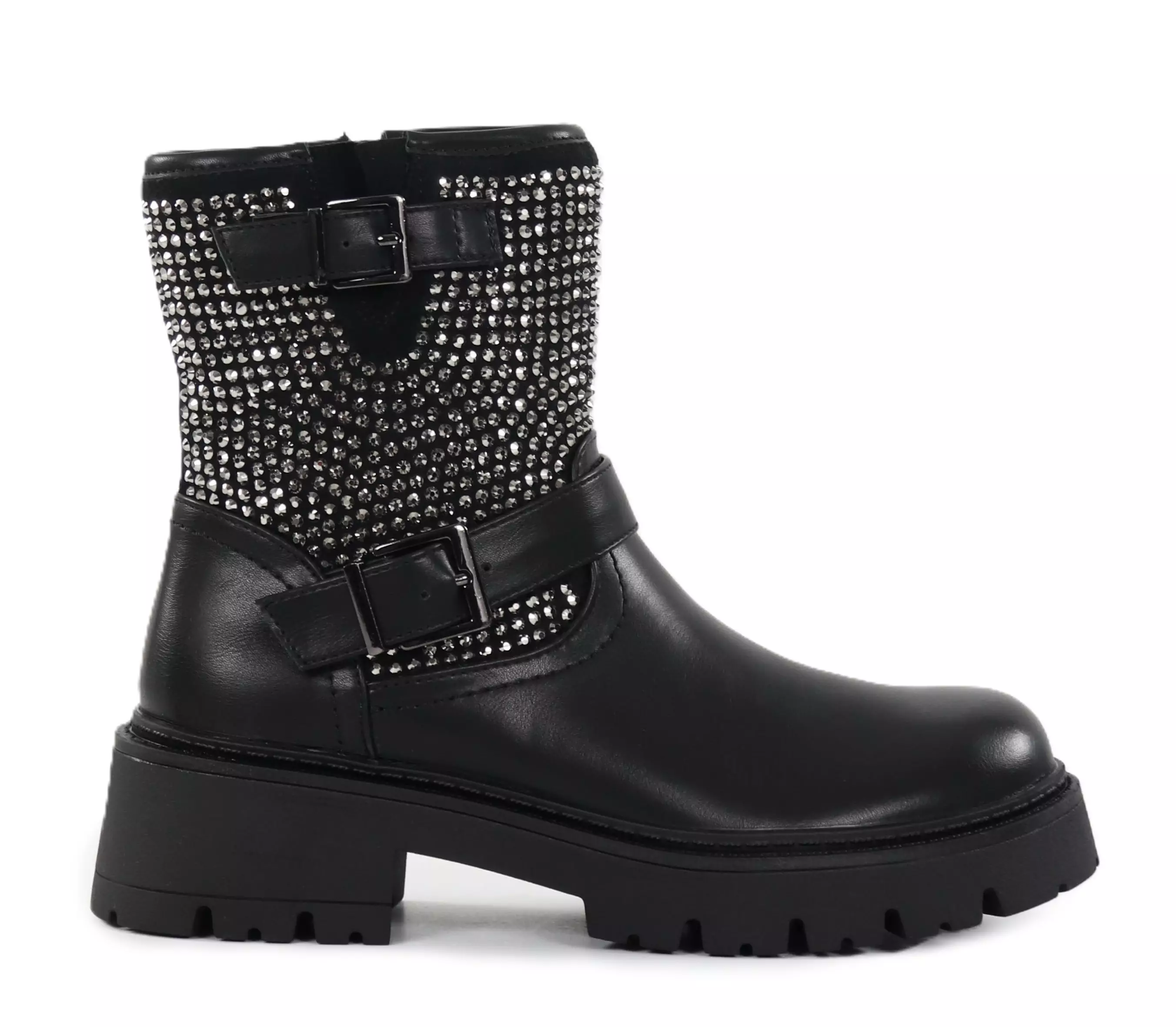 Die Duffy-Ankle Boots verbinden einen trendigen Look mit auffälligen Details. Die funkelnden Strasssteine an der Schaftoberseite verleihen einen Hauch von Glamour, während die zwei Schnallen an der Außenseite eine robuste Note hinzufügen. Eine stilvolle Wahl, wenn Sie lässig modisch auffallen möchten!