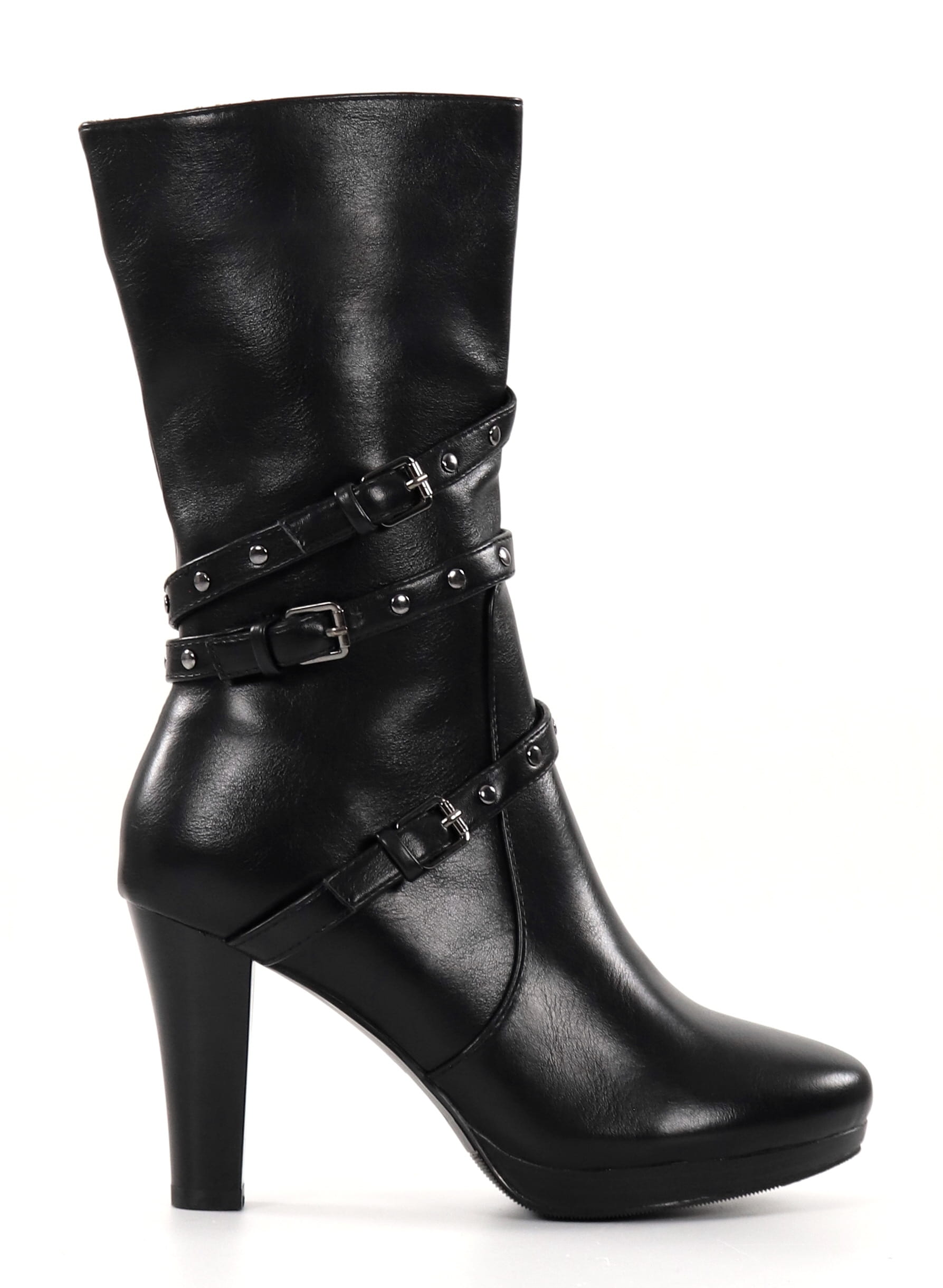 Auffällige Stiefel mit Absatz und dekorativen Schnallen.