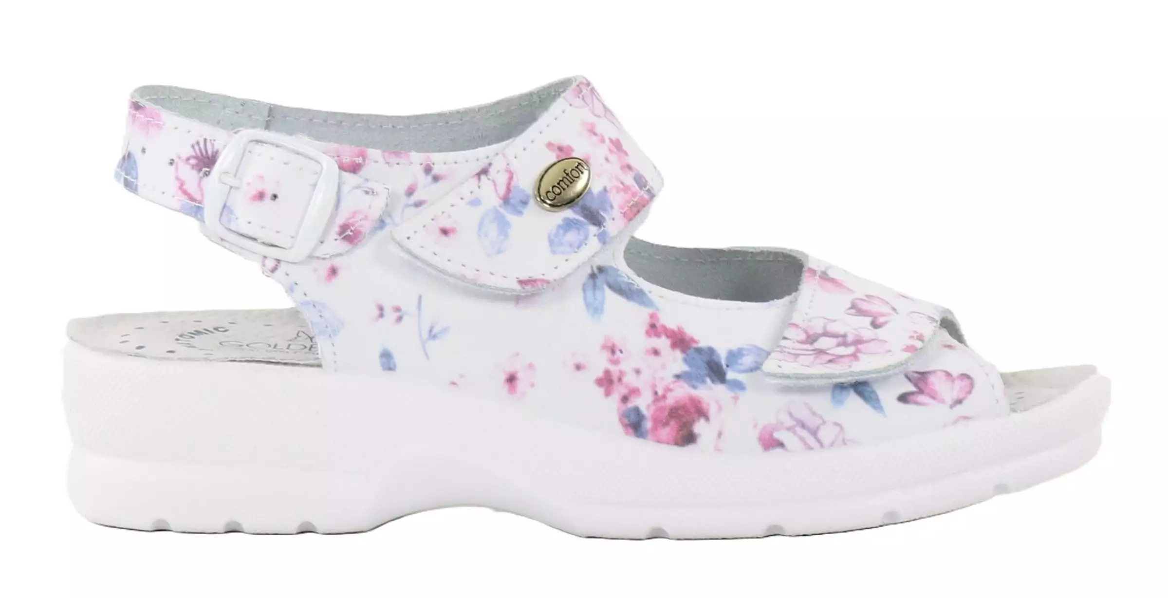 Leder-Sandalen mit einem schönen Blumenmuster und drei verstellbaren Riemen, die einen perfekten Sitz garantieren.
