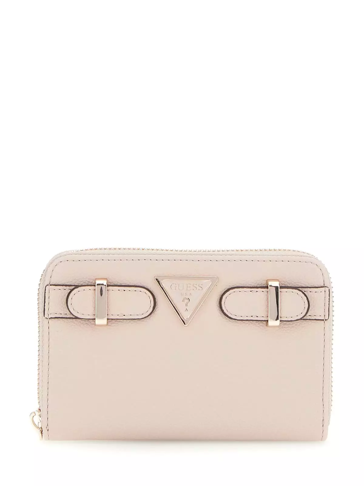 Stylische beige Guess Geldbörse mit goldenen Details.