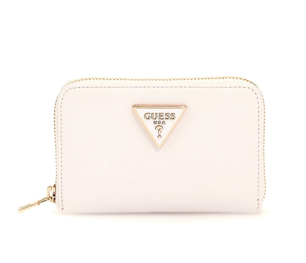 Eine stilvolle Geldbörse mit einer Guess-Logo-Plakette auf der Vorderseite.
