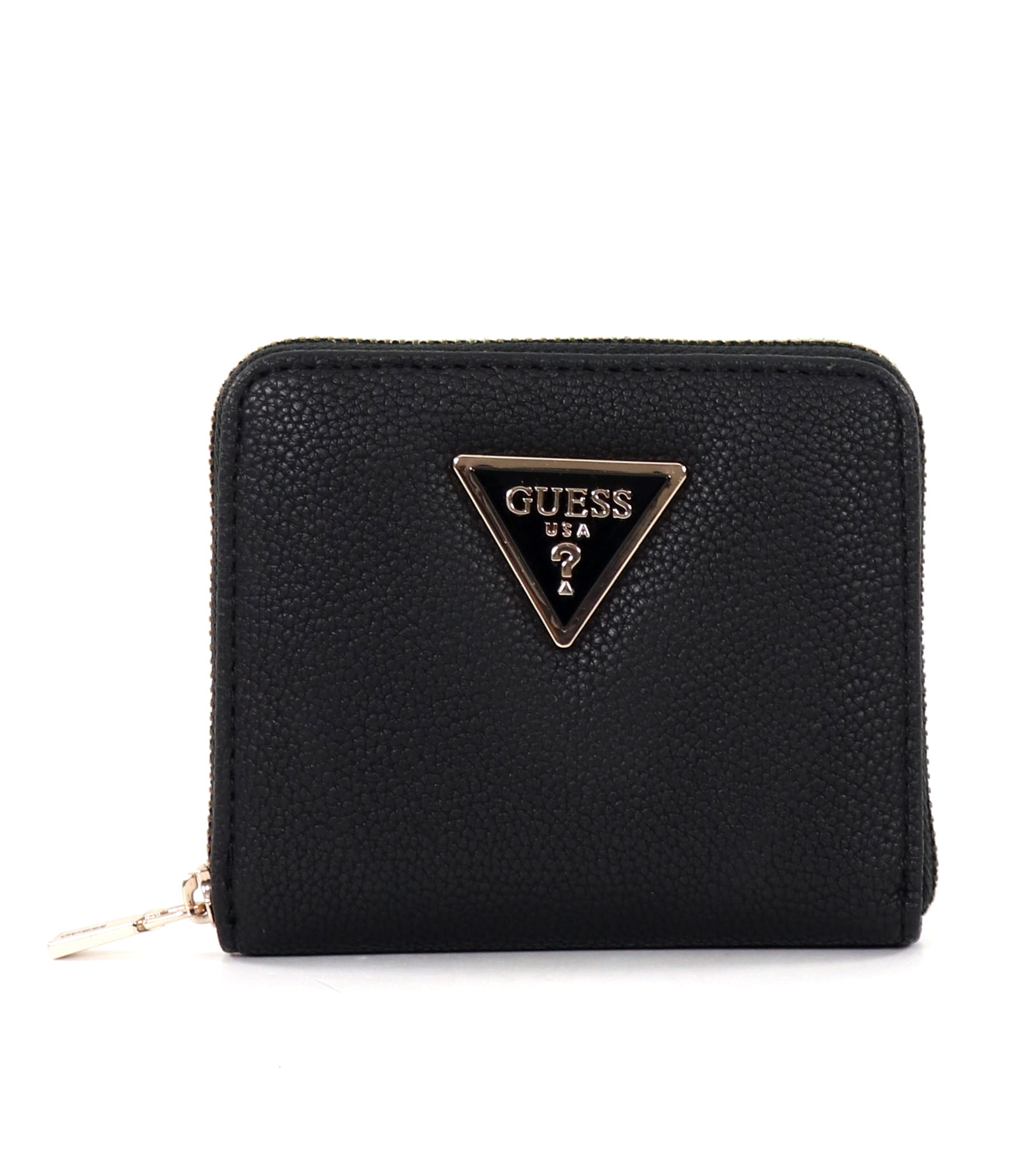 Eine stilvolle Geldbörse mit einem Guess-Logo-Platte auf der Vorderseite.
