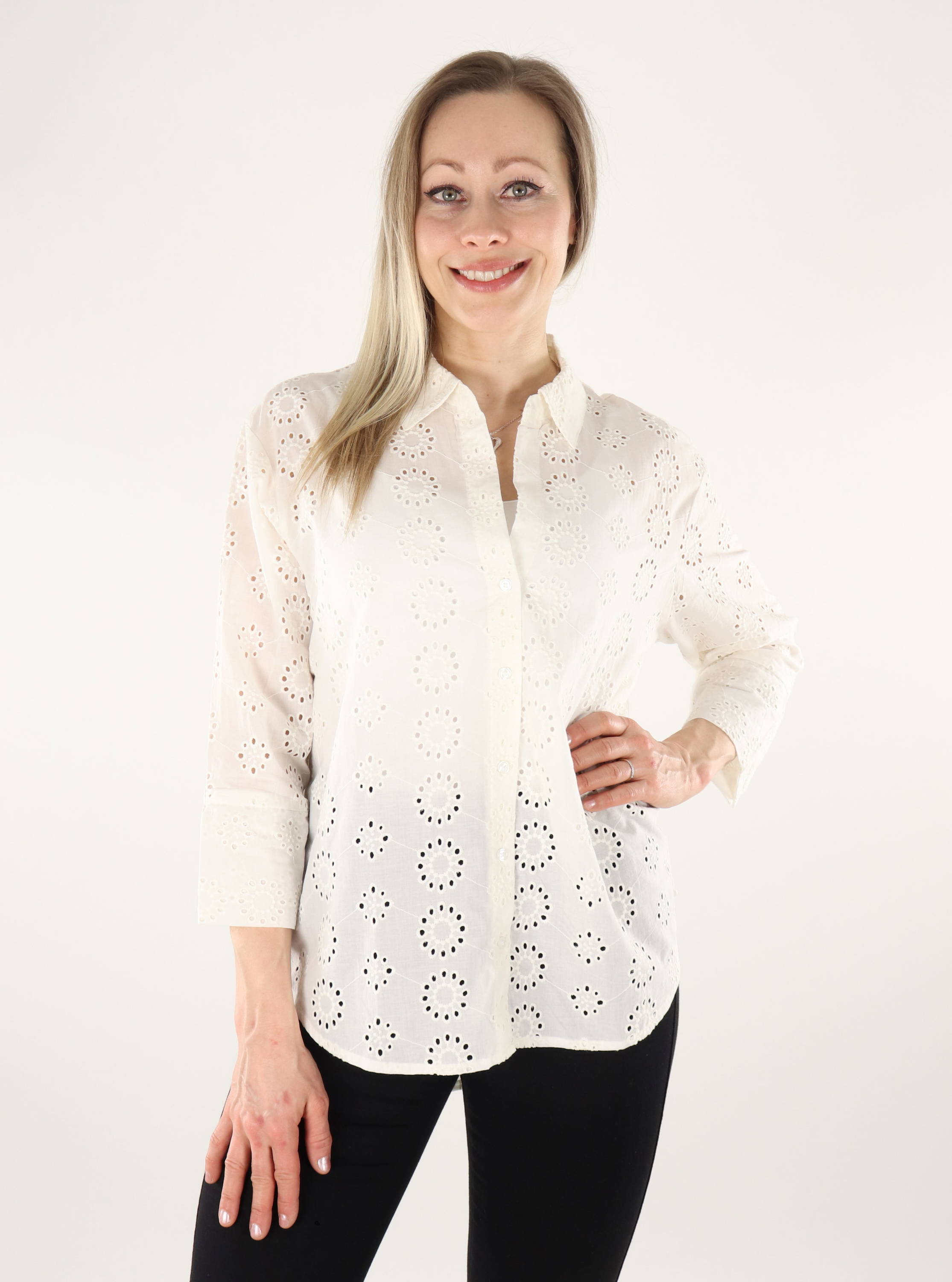 Entspanntes Modell Bluse mit schöner Spitzenstickerei. Längeres Modell, abgerundeter Saum.