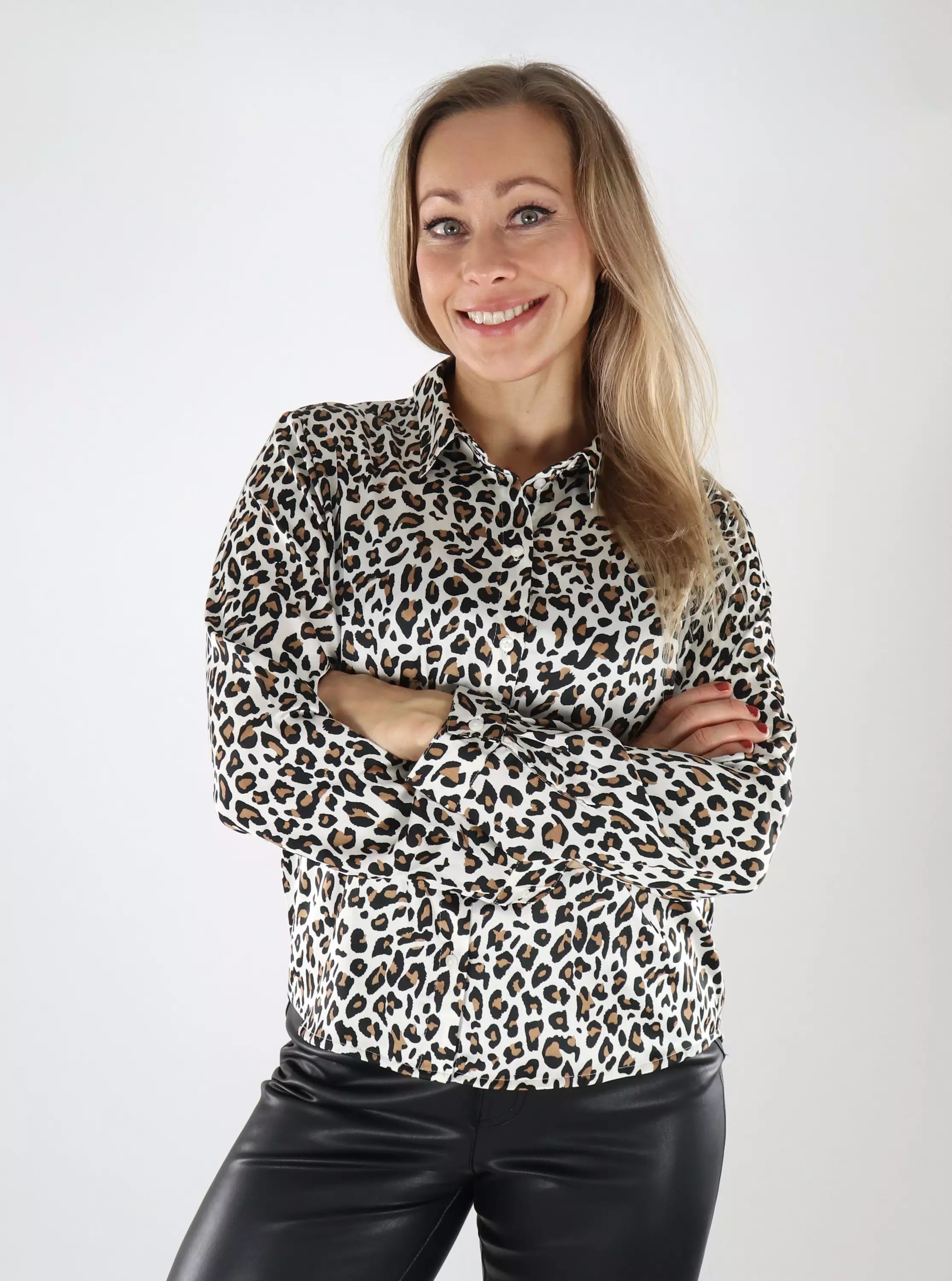 Leichte und glänzende Bluse aus hochwertigem Material mit trendigem Leopardenmuster. Vielseitiges Design, das sowohl für den Alltag als auch für schickere Anlässe geeignet ist.