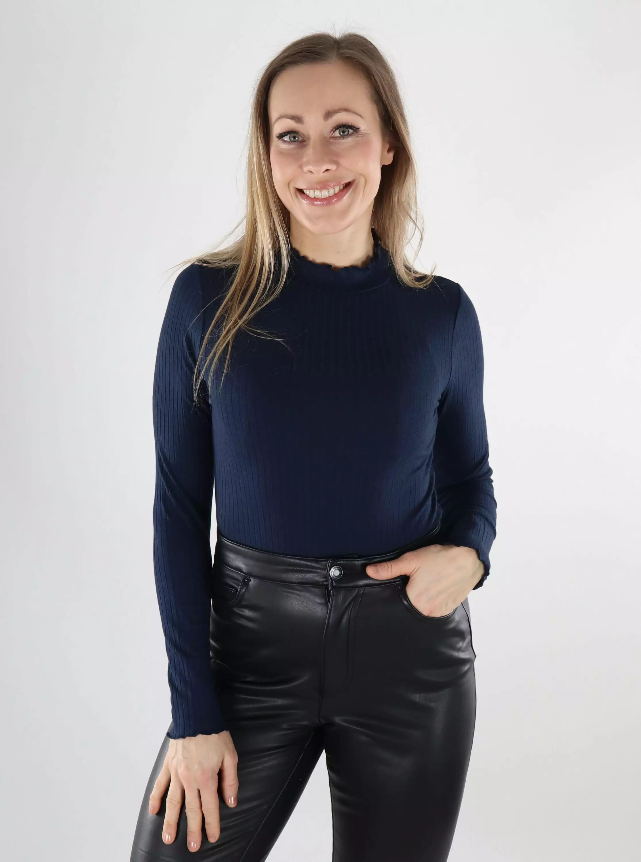 Ein Ripp-Pullover mit hohem Kragen, dessen Rüschendetails dem Look Leichtigkeit verleihen. Das angenehme Material macht ihn zum Lieblingsstück für den Alltag!