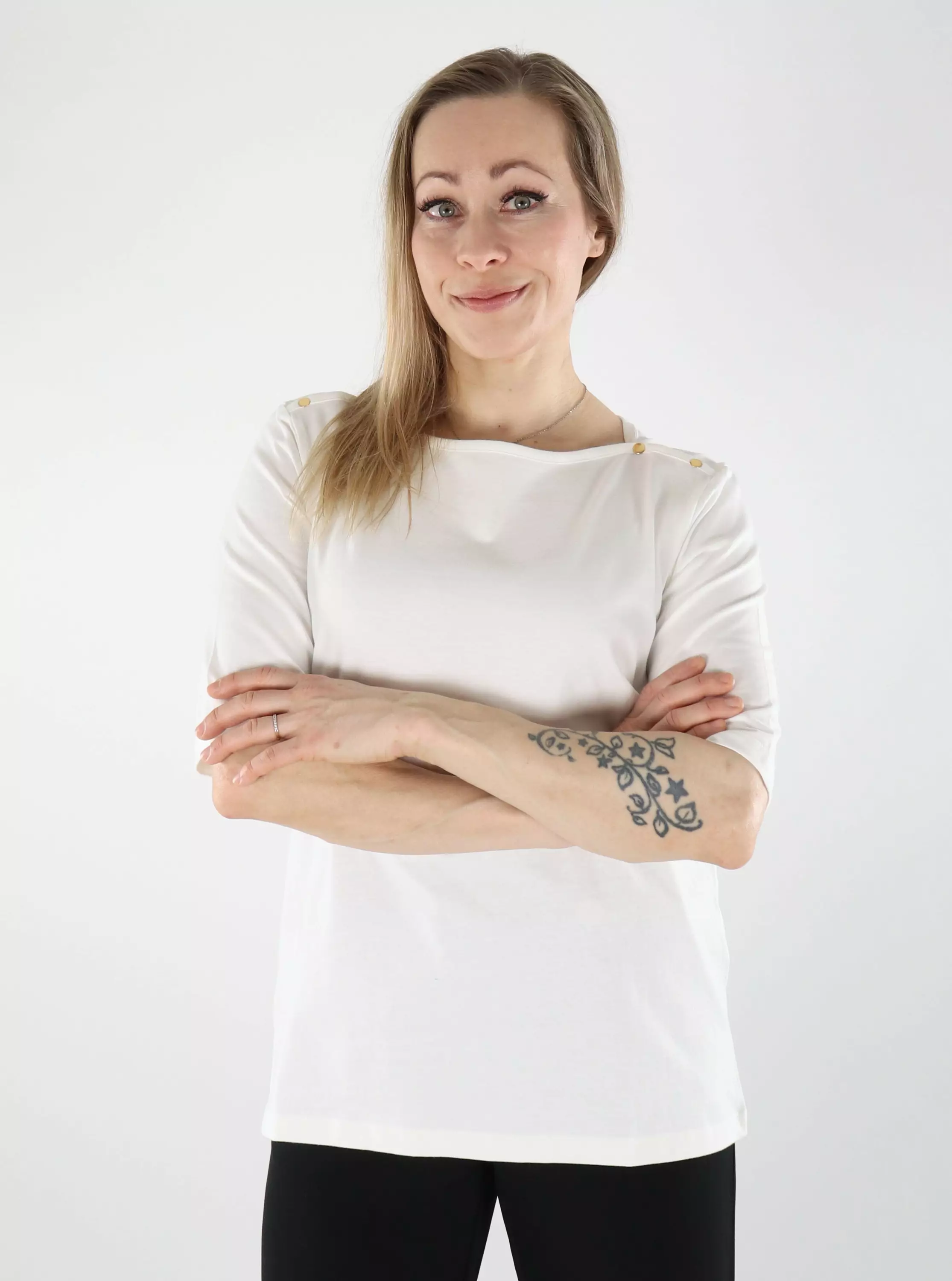 Ein T-Shirt aus Bio-Baumwolle, dessen wunderschöne goldene Knopfdetails einen Hauch von Eleganz verleihen! Das weiche und atmungsaktive Material sorgt dafür, dass das Shirt den ganzen Tag über angenehm zu tragen ist.
