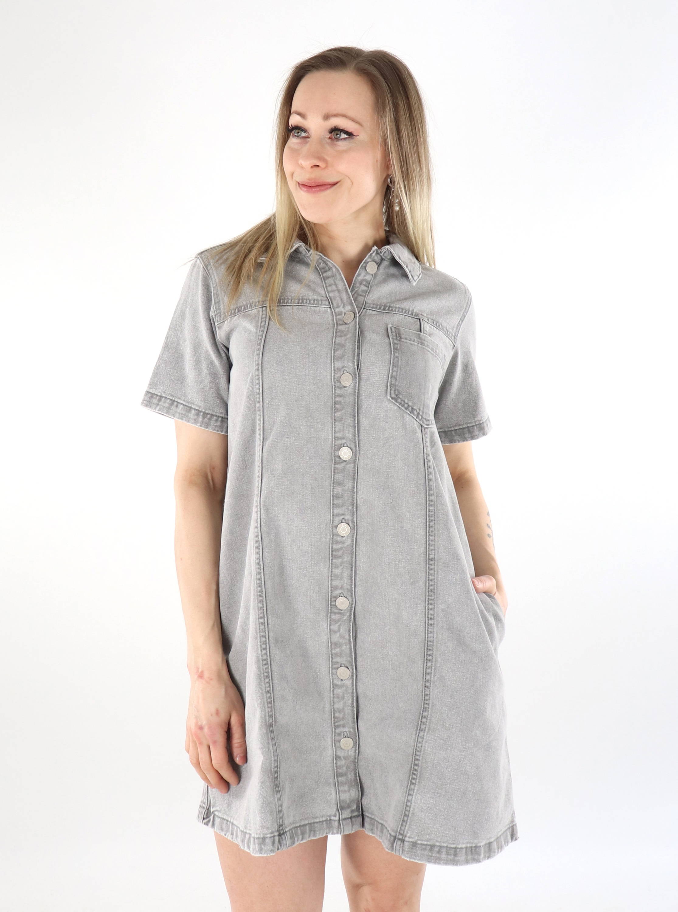 A-Linien Jeanskleid mit praktischen Taschen an den Seiten! Hergestellt aus hochwertiger und strapazierfähiger Baumwolle.