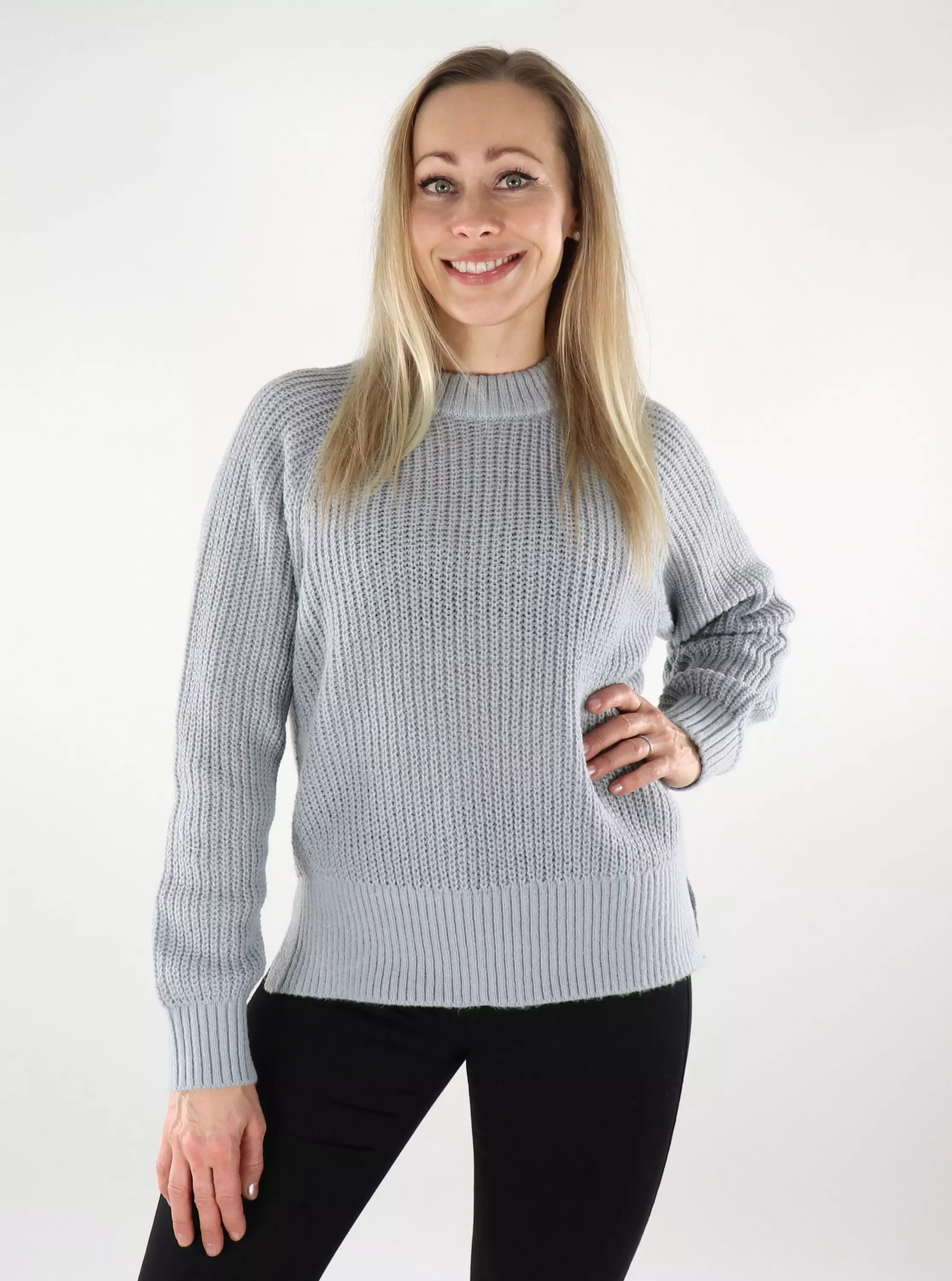 - Strickbündchen an Ausschnitt, Saum und Ärmeln