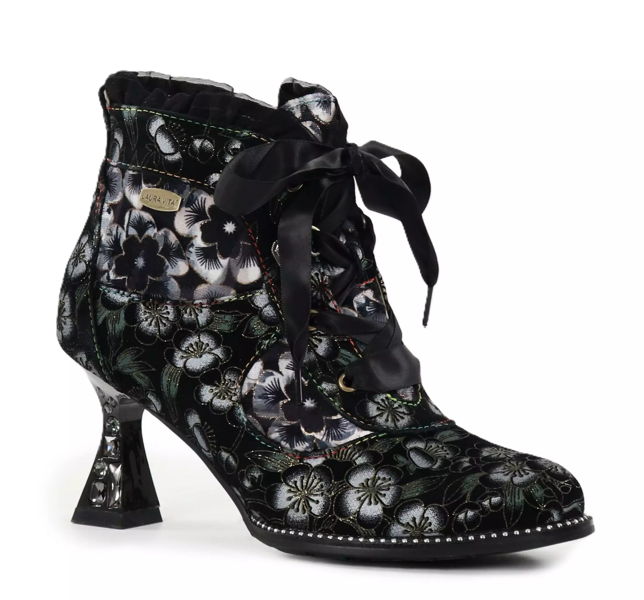 Diese bezaubernden Laura Vita Stiefeletten vereinen ein auffälliges Blumendesign, Satinbänder und eine wunderschön mit Strasssteinen verzierte Absatzhöhe – die perfekte Wahl, um deinem Outfit einen Hauch von Luxus zu verleihen. Der seitliche Reißverschluss erleichtert das An- und Ausziehen, während hochwertige Details den einzigartigen und femininen Stil abrunden.