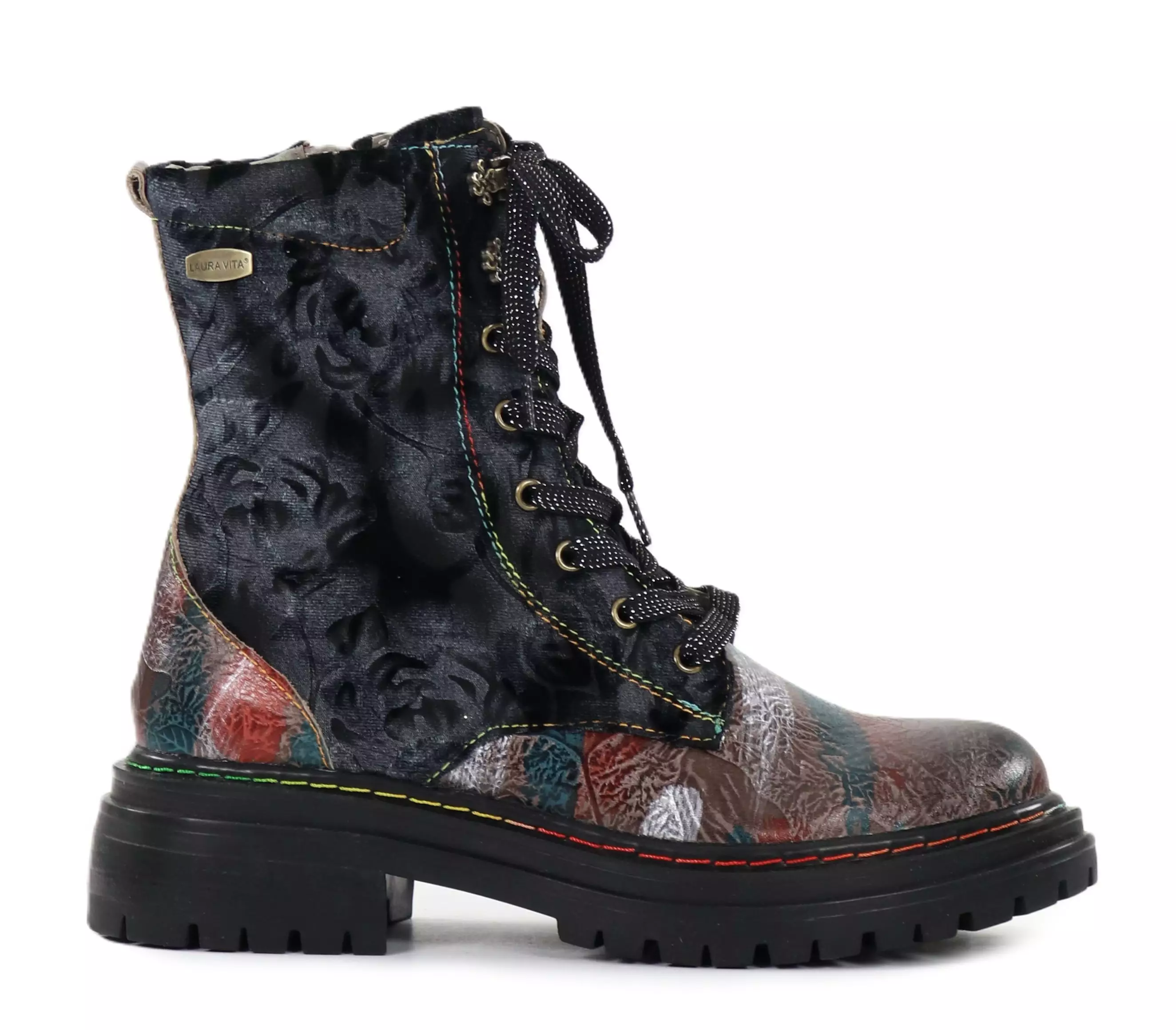 Die individuellen Laura Vita Stiefeletten kombinieren die Robustheit des Biker-Stils mit auffälligen Mustern. Das hochwertige Leder-Material und das detaillierte Design machen diese Schuhe zu einem echten Blickfang. Eine perfekte Wahl, wenn du stilvoll auffallen möchtest!