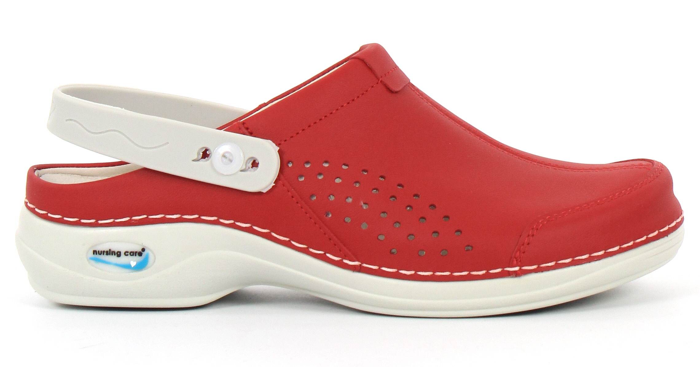 Die Arbeitsschuhe haben einen verstellbaren und umlegbaren Riemen an der Ferse. Die Absatzhöhe beträgt ca. 3 cm.