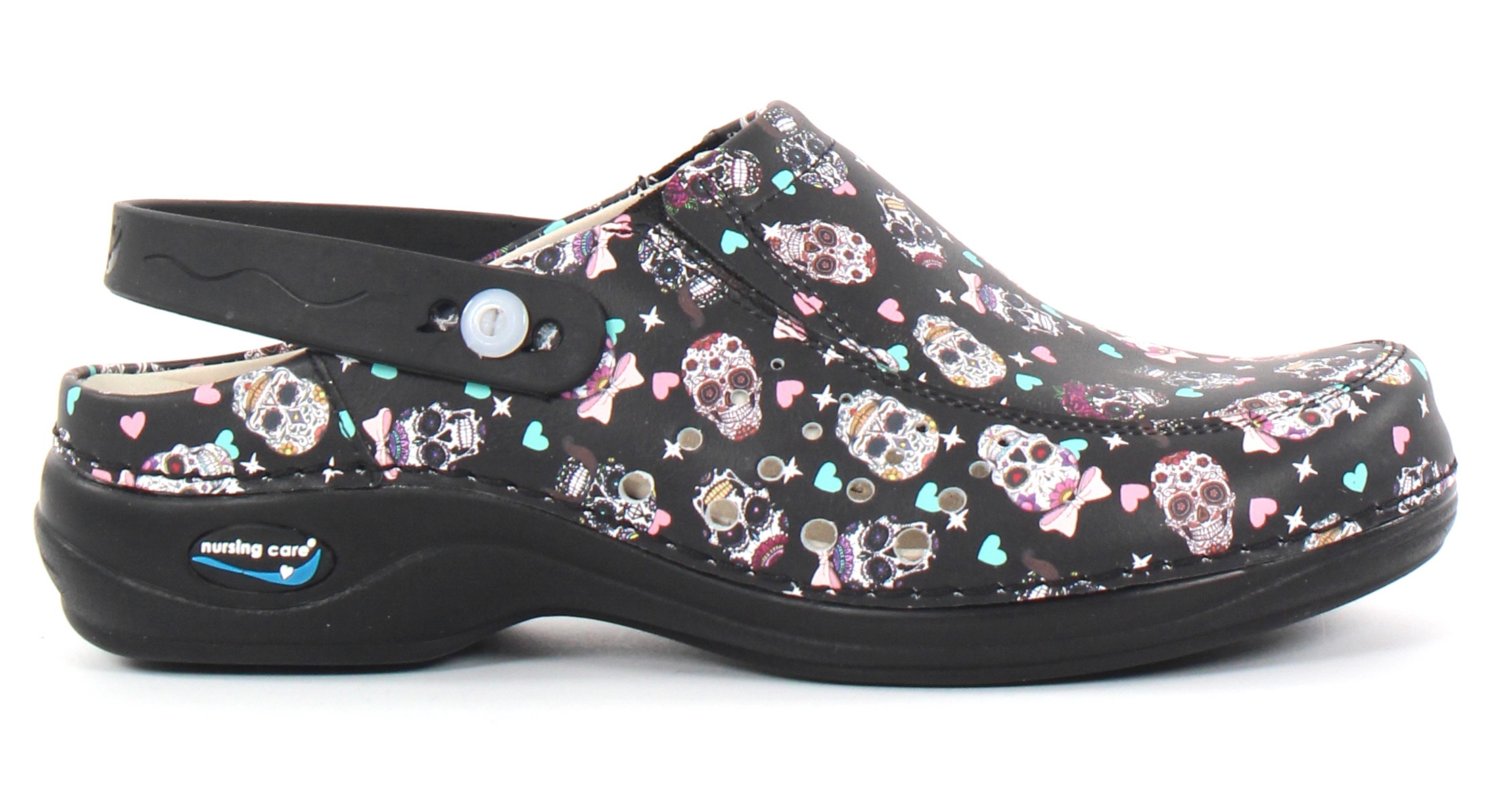 Die Arbeitsschuhe verfügen über einen verstellbaren, umklappbaren Riemen hinten. Die Absatzhöhe beträgt ca. 3 cm.