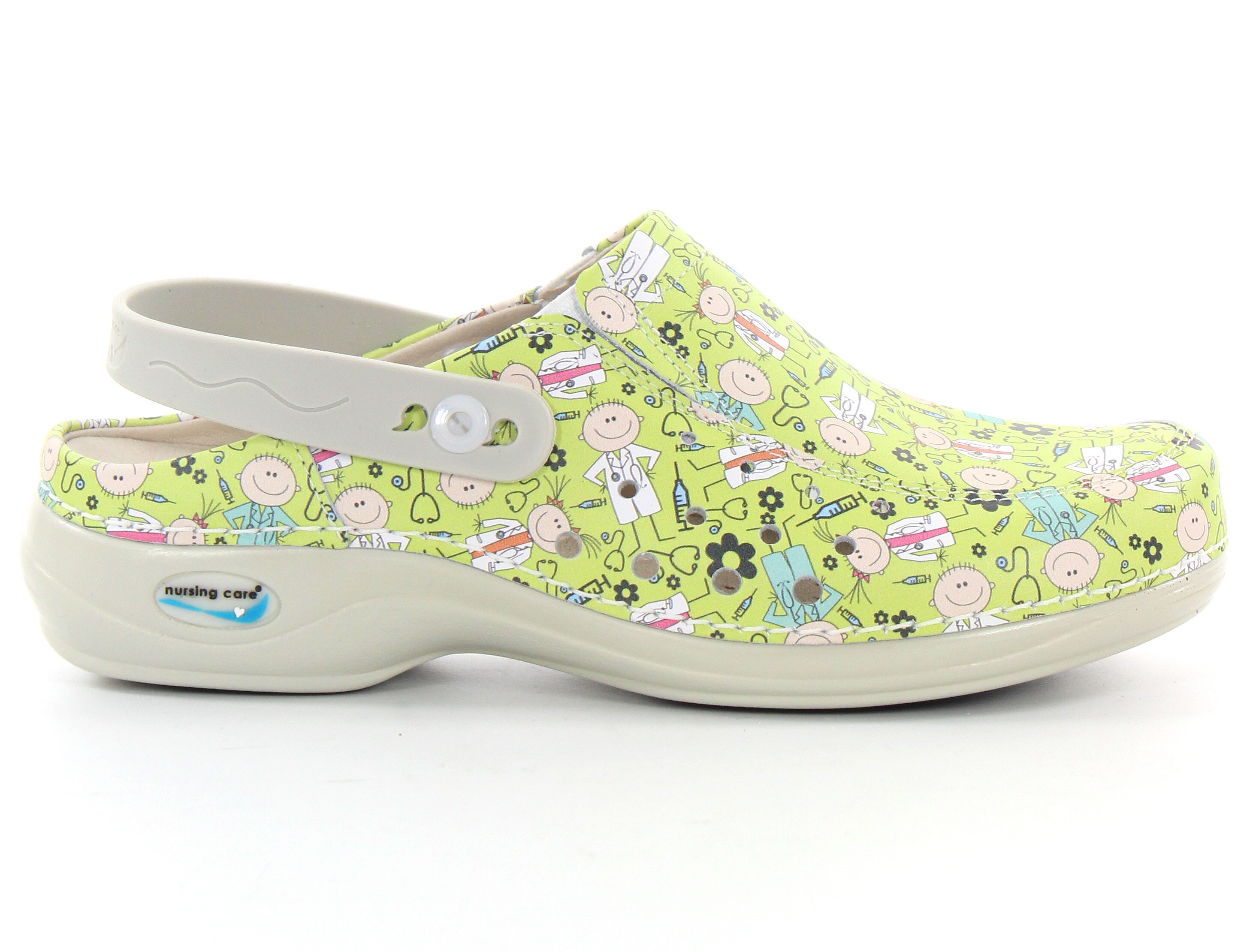 Die Arbeitsschuhe haben einen verstellbaren und umklappbaren Riemen an der Ferse. Die Absatzhöhe beträgt ca. 3 cm.