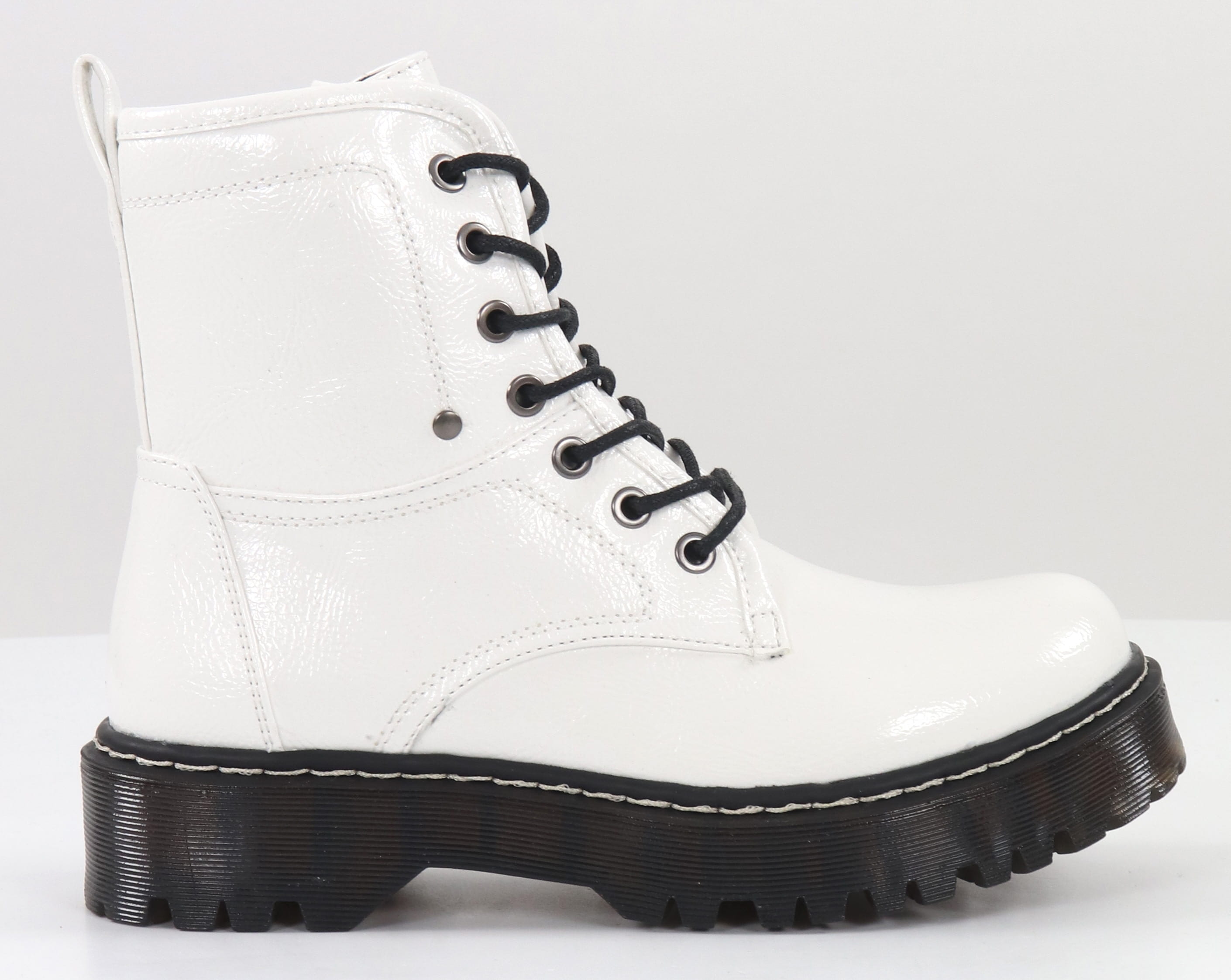 Glänzende Stiefeletten aus synthetischem Leder mit dünnem Kunstfellfutter.