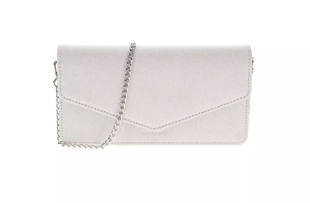 Eine klassisch stilvolle Kuvert-Tasche mit Kette und Kunstlederriemen.