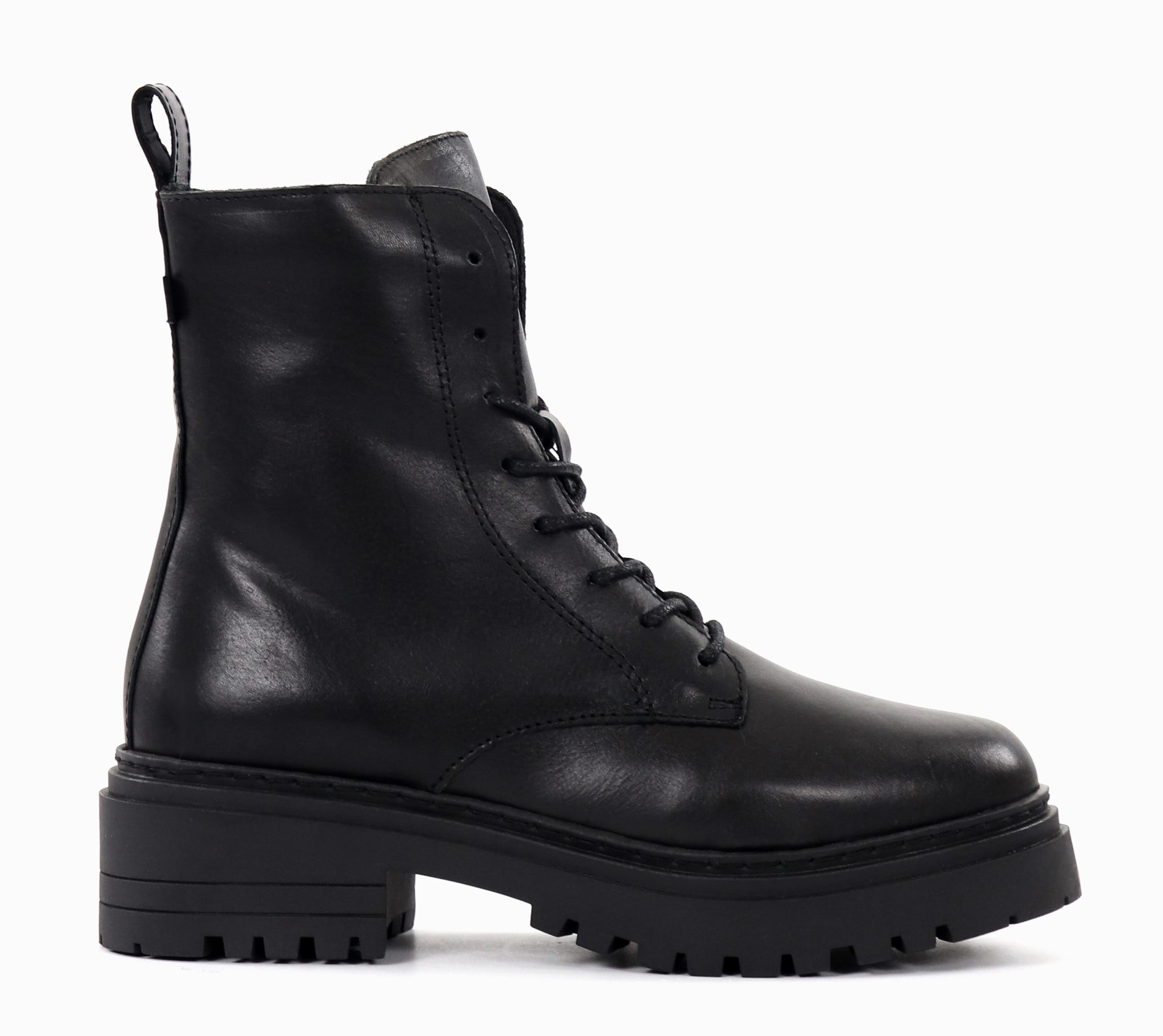 Schwarzlederne Ankle Boots im Combat-Stil mit dicker Sohle und weichem Kunstfellfutter.
