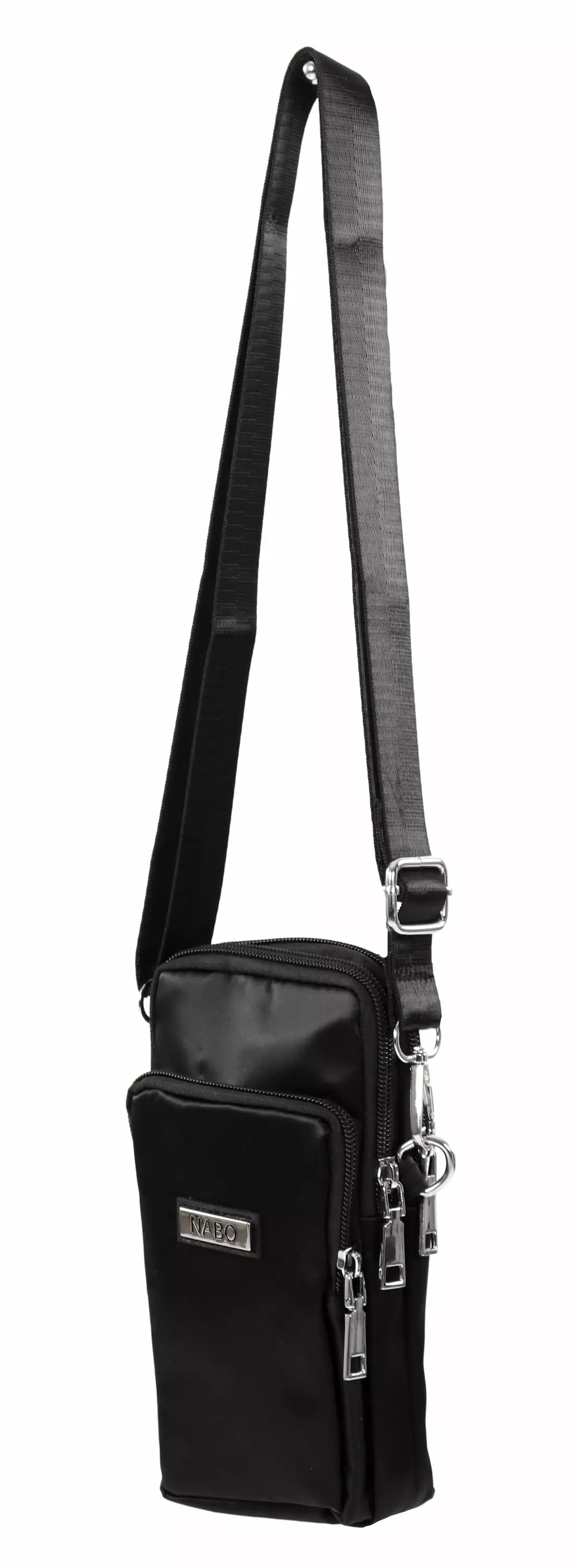 Schwarze Textil-Handy-Tasche/Kleinlederwaren mit verstellbarem Schulterriemen.