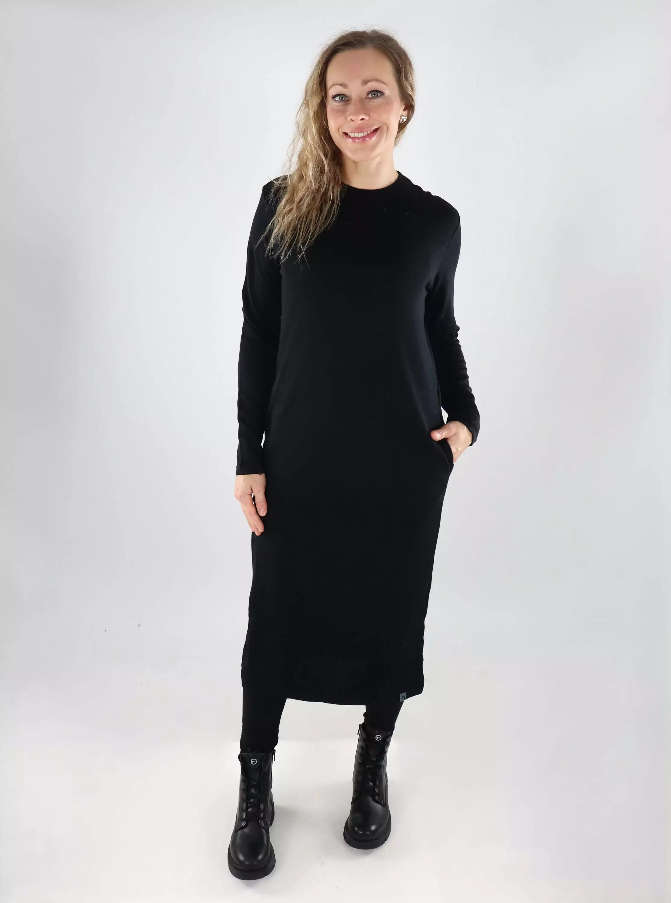 Das vielseitige Asta-Kleid ist eine stilvolle Wahl für den Alltag. Das gerade, knielange Modell mit langen Ärmeln und seitlichen Taschen eignet sich sowohl für das Büro als auch für die Freizeit. Das Kleid verfügt über einen elastischen Rundhalsausschnitt und Schlitze an den Seiten. Der angenehme Merino-Bamboo-Jersey kombiniert die Atmungsaktivität von Merinowolle mit der Weichheit von Bambusviskose – für einen angenehmen Tragekomfort den ganzen Tag.
