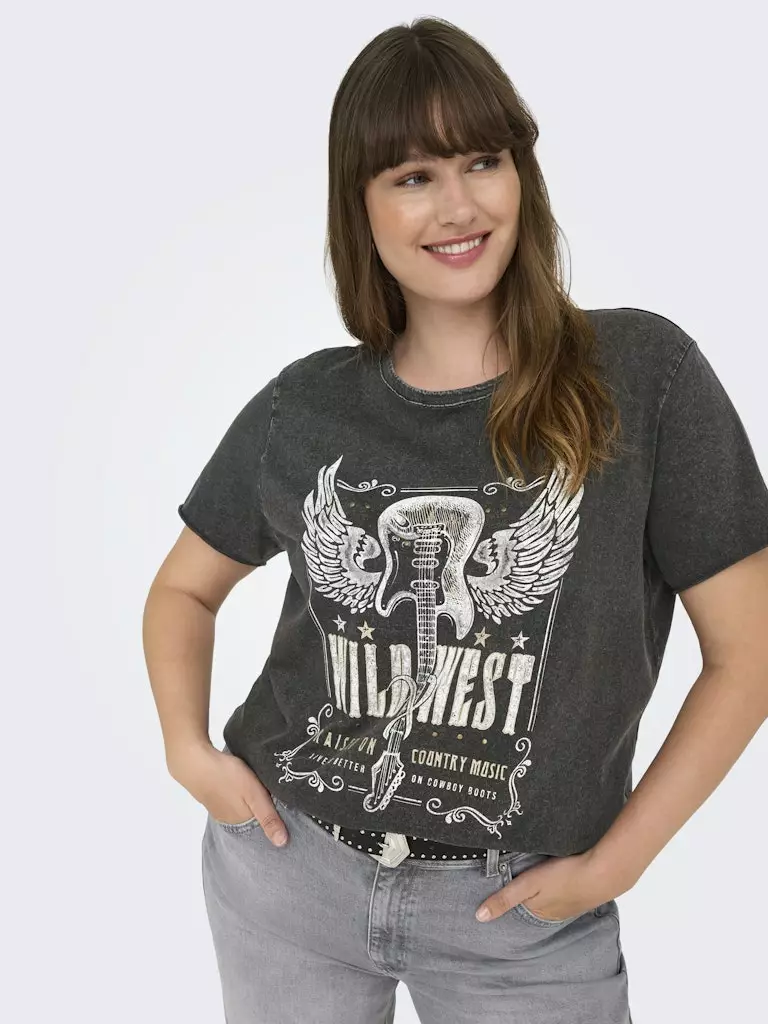 Stylisches Plusgröße T-Shirt, hergestellt aus weicher Bio-Baumwolle, veredelt mit einem auffälligen Druck, der mit schimmernden Strassverzierungen versehen ist. Eine bequeme und verantwortungsvolle Wahl für den Alltag – mit einem Hauch von Glamour.