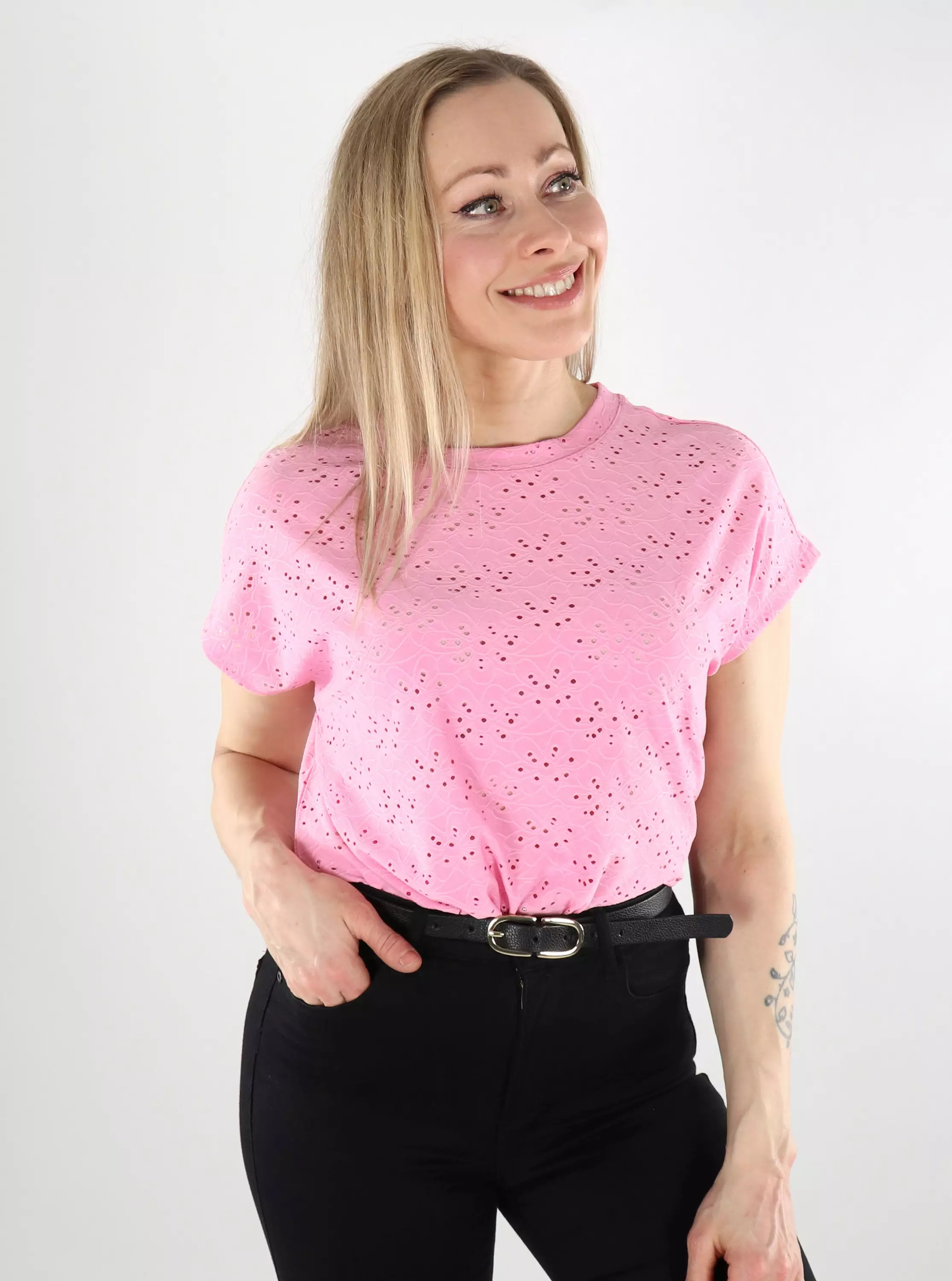 Damen T-Shirt mit Lochmuster und abgerundeter, längerer Rückseite.