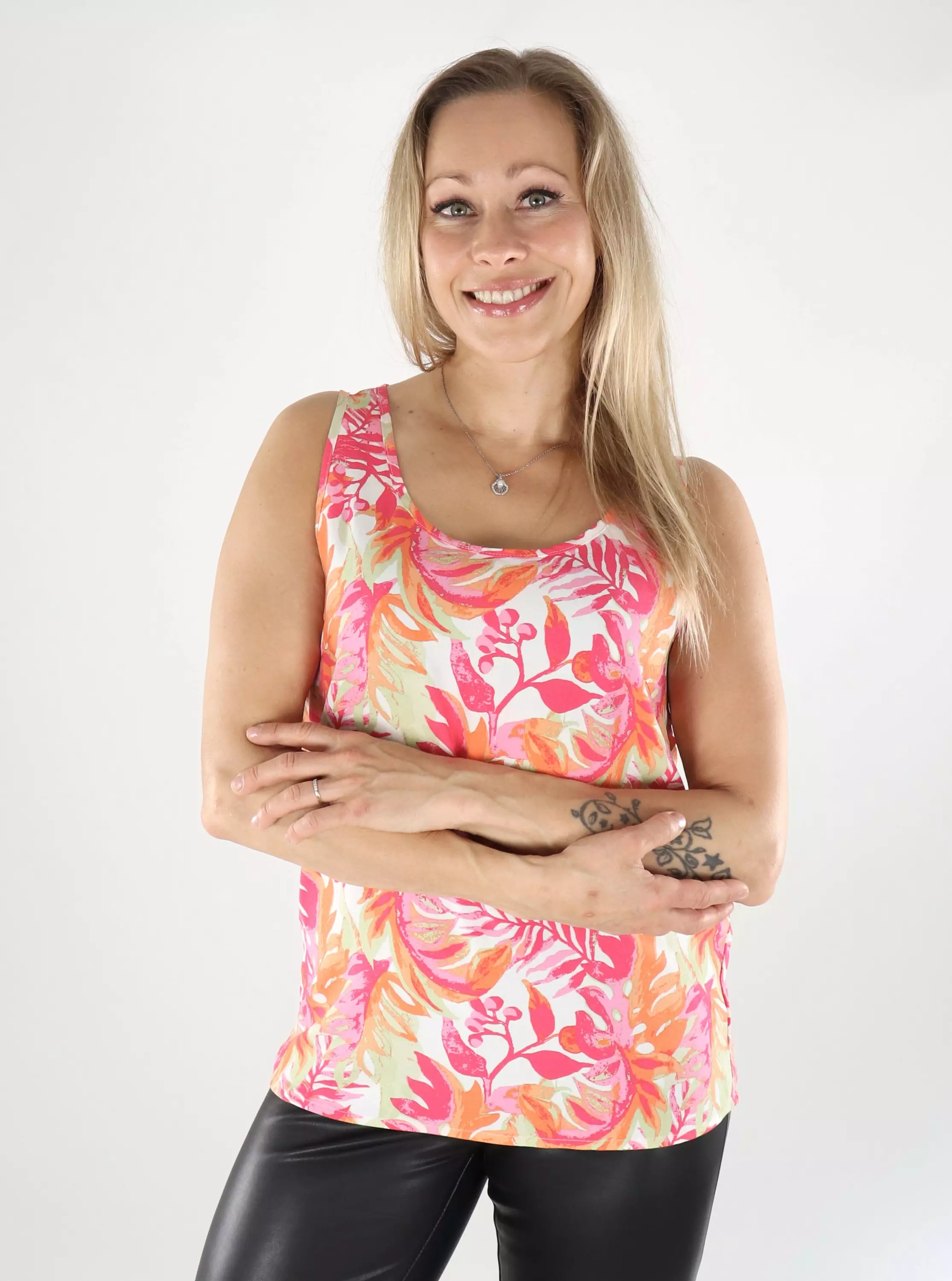 Dieses farbenfrohe, stilvoll gestaltete Top vereint frischen Stil mit angenehm weichem Viskosematerial, das sich sanft auf der Haut anfühlt. Eine mühelose Wahl für lässige Sommertage oder zum Schichten unter einem Blazer oder einer Strickjacke.