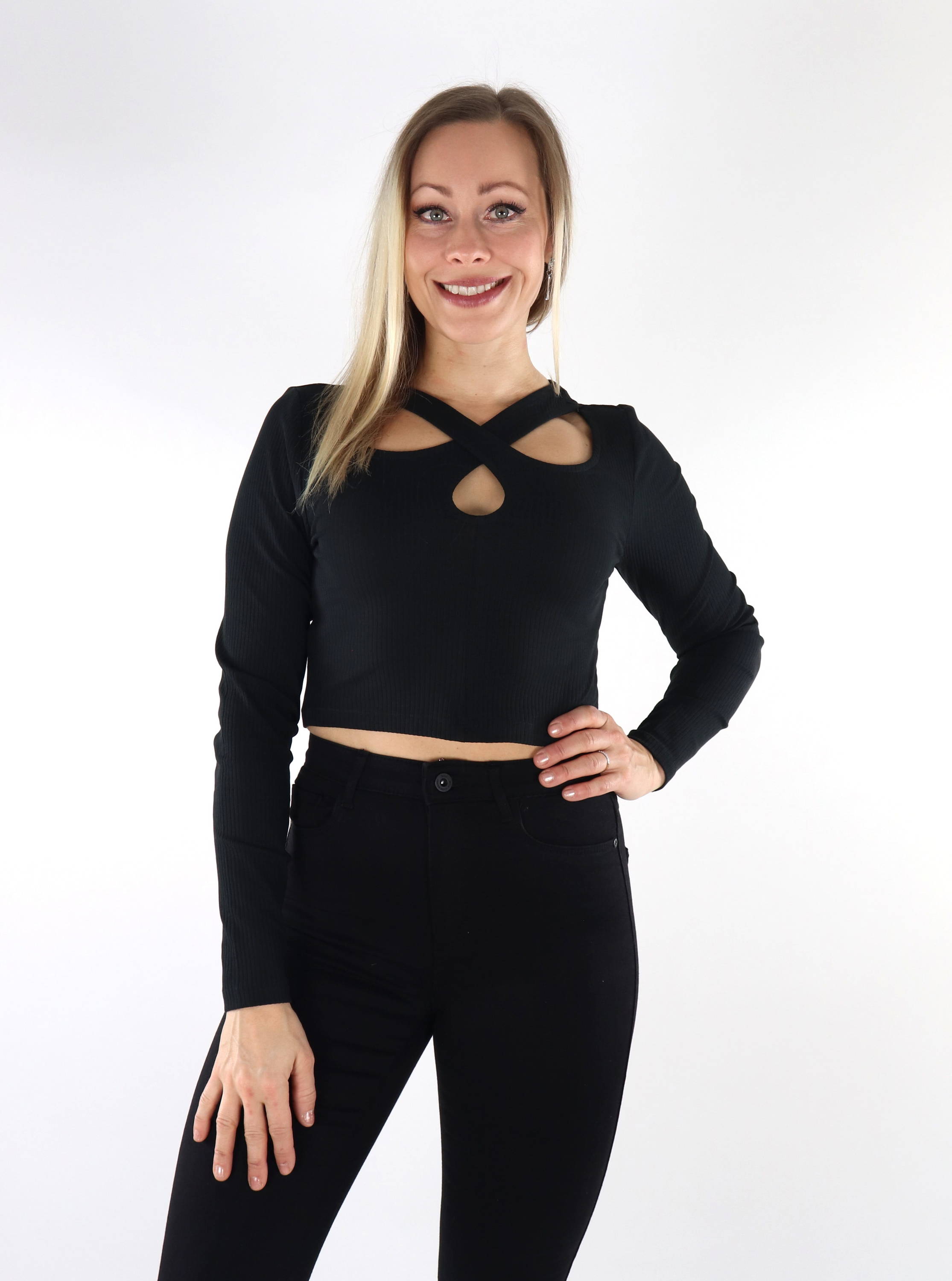 Dehnbares Rippenshirt, kurzer cropped Saum.