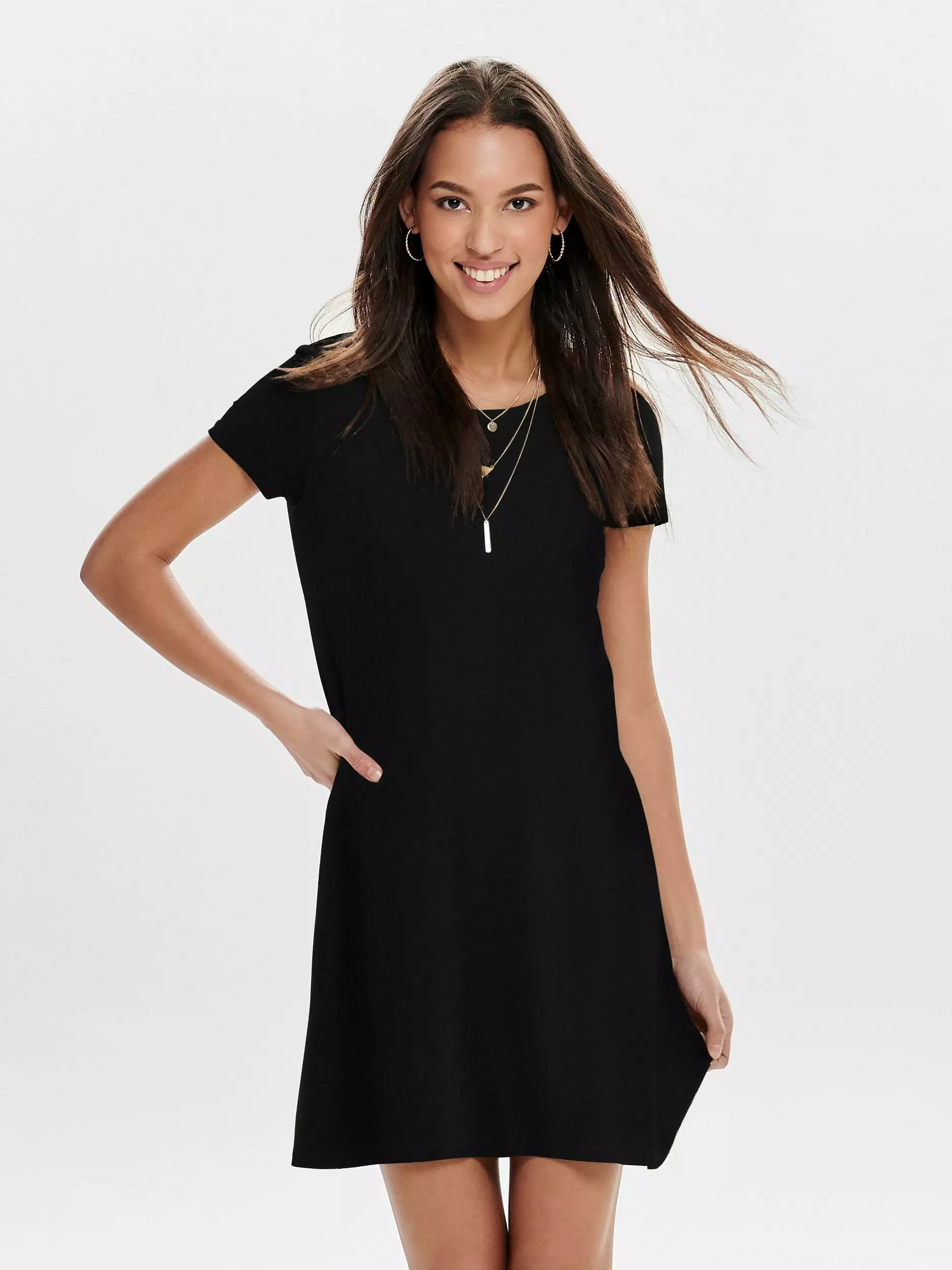 Kleid mit T-Shirt-Ärmeln aus elastischem Stoff.