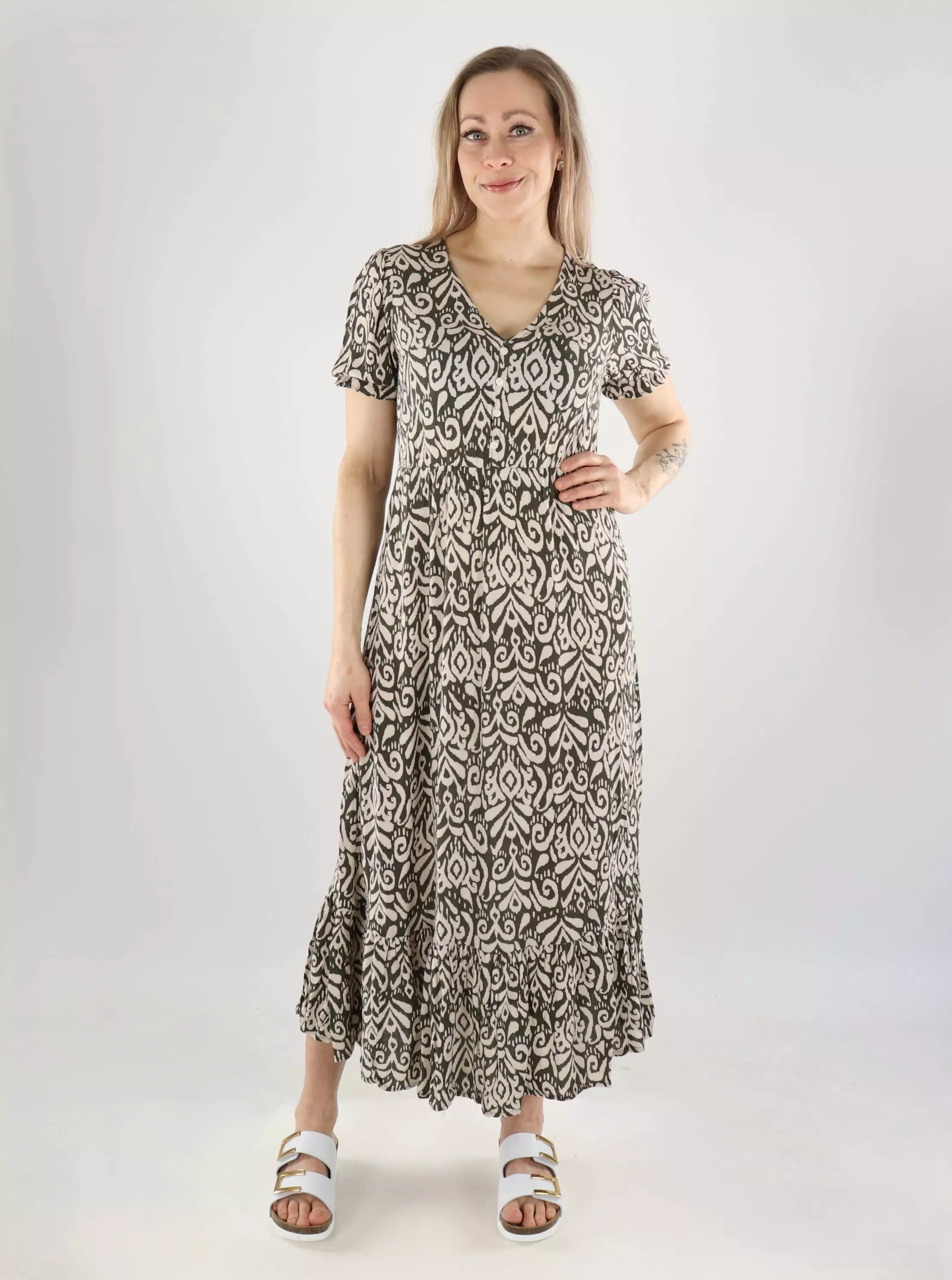 Gemustertes Maxikleid, das aus besonders weicher und leichter Viskose gefertigt ist und somit die perfekte Wahl für warme Tage darstellt. Der luftige Schnitt fällt schön und bietet sowohl Komfort als auch Stil für den Alltag und besondere Anlässe.