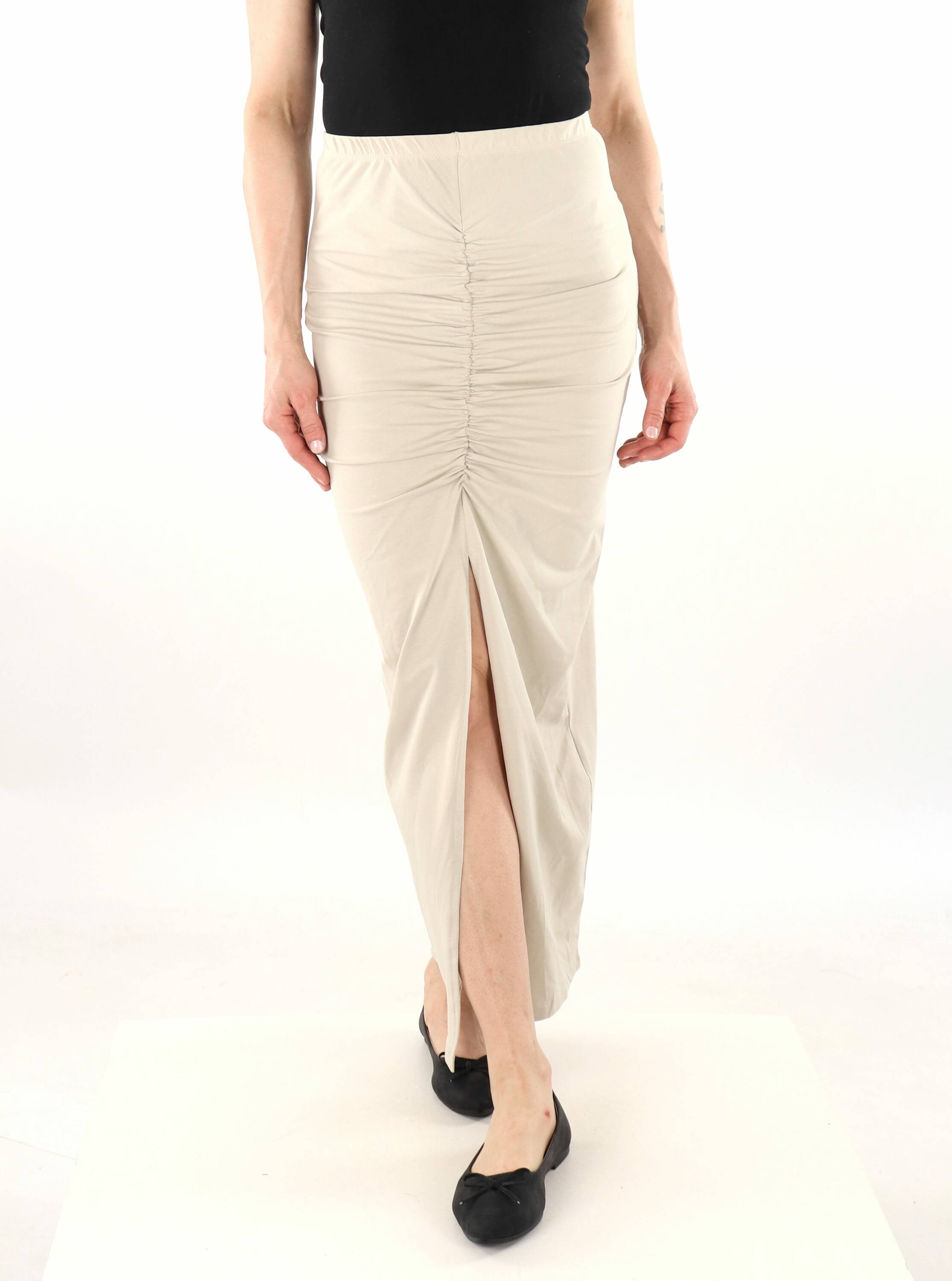 Ein dehnbarer Rock mit sichtbarem Raffung und Schlitz vorne.