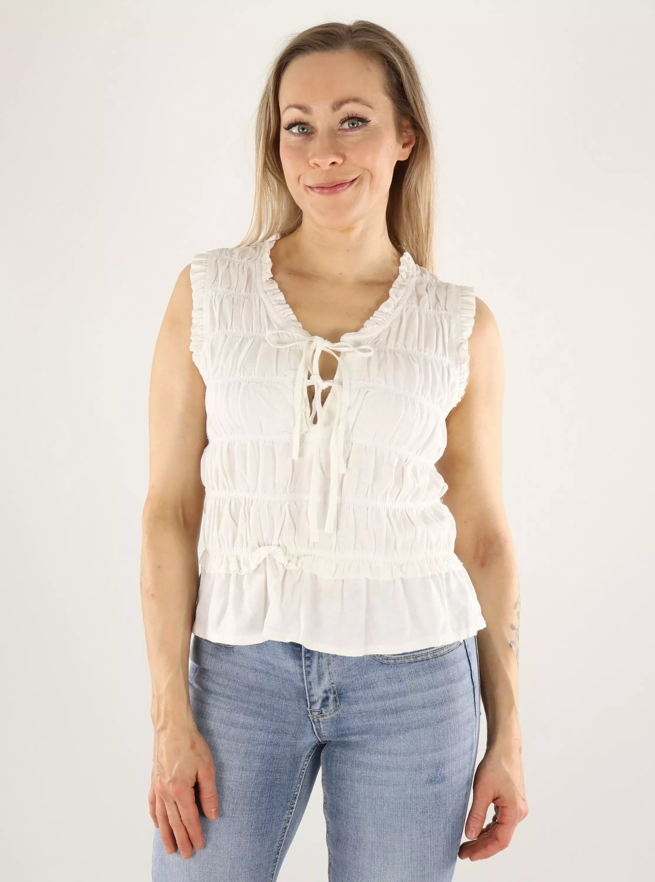 Erschaffe einen sanften und stilvollen Look mit diesem ONLY Volant-Top. Das Top verfügt über schöne Falten und vorn zu bindende Bänder.