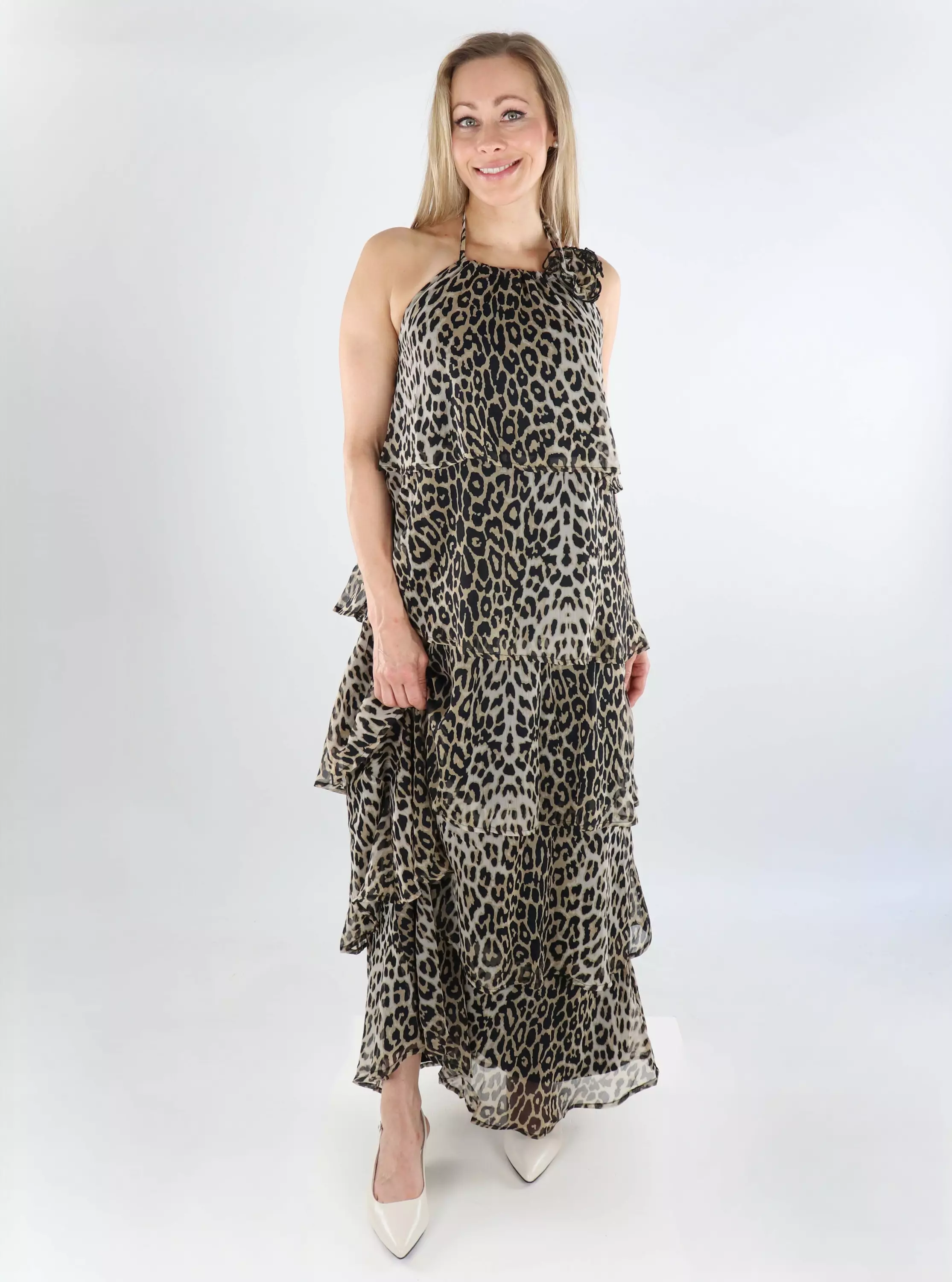 Das Leo-Print Maxikleid von Pieces mit einem geschichteten Rüschensaum sorgt für einen leichten und auffälligen Look. Der Blumen-Ausschnitt gibt dem Kleid eine elegante Note!