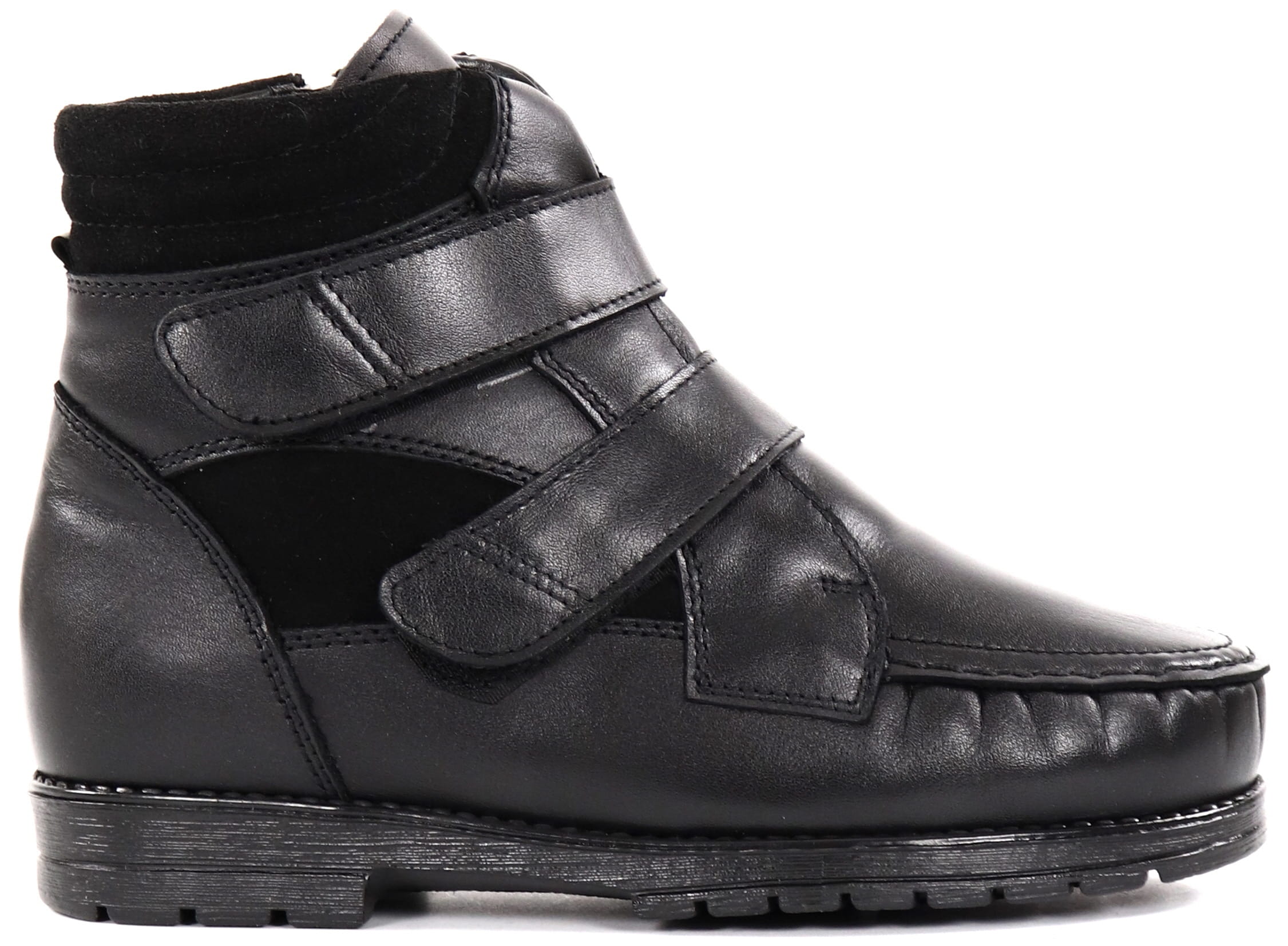 Wärmende und weit geschnittene Leder-Stiefel mit Klettverschluss.