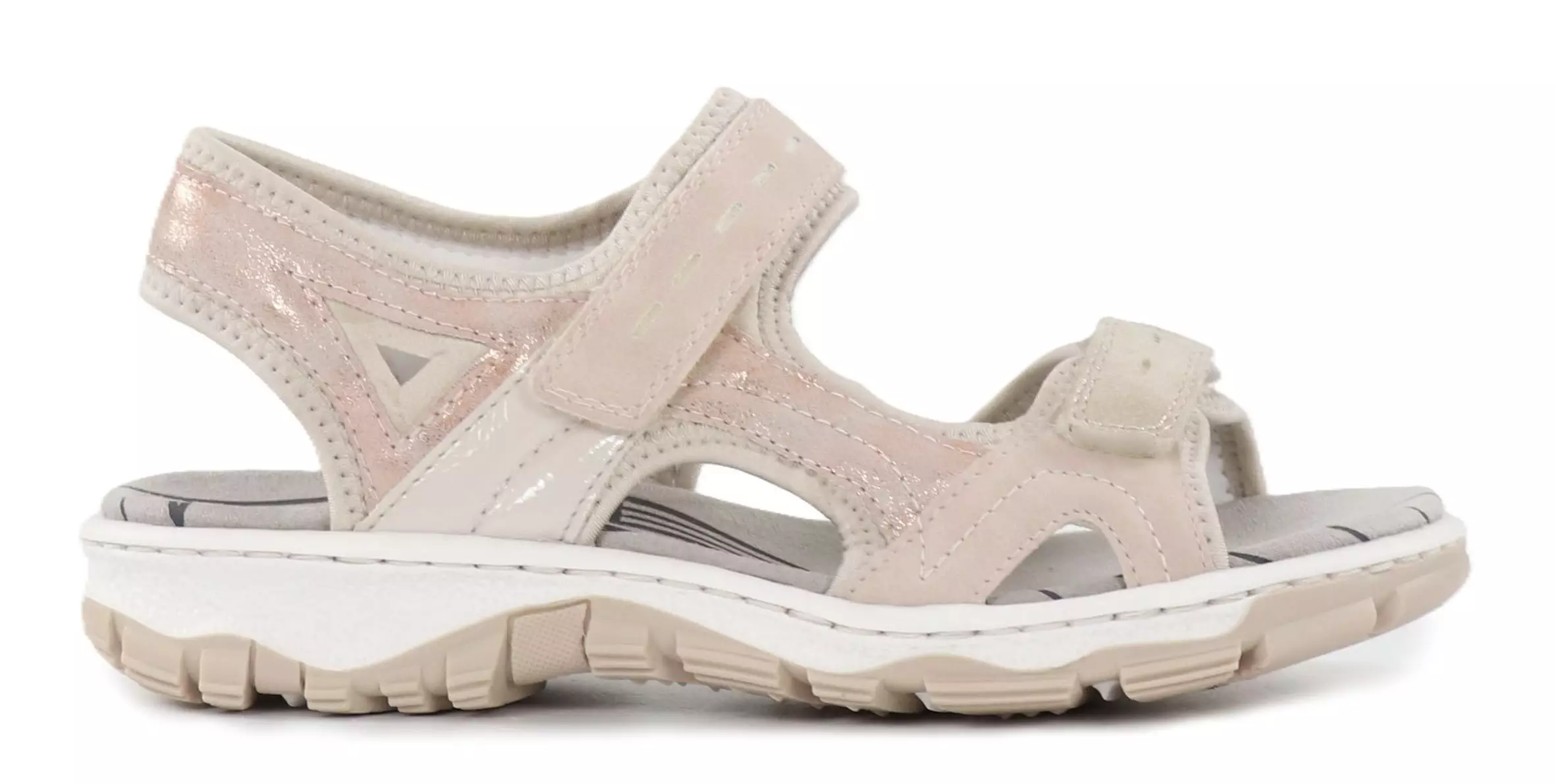 Diese äußerst komfortablen Sandalen mit verstellbaren Klettverschlüssen bieten perfekten Halt für Ihre Füße! Das Obermaterial ist in einem schönen Rosé/Nude-Ton gehalten und verziert mit roségoldenen Glitterelementen.