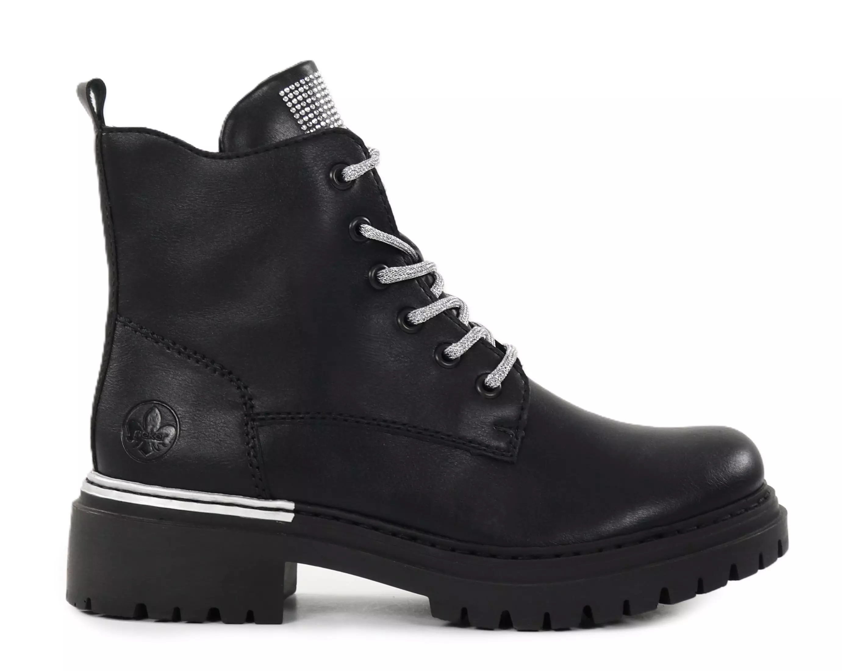 In diesen auffälligen Rieker-Stiefeletten vereinen sich der robuste Stiefelstil mit einem femininen Glanz. Die schimmernden Schnürsenkel und Strass-Applikationen verleihen genau den richtigen Hauch von Glamour. Das warme und leichte Kunstfellfutter sorgt auch an kälteren Tagen für ein angenehmes Tragegefühl.