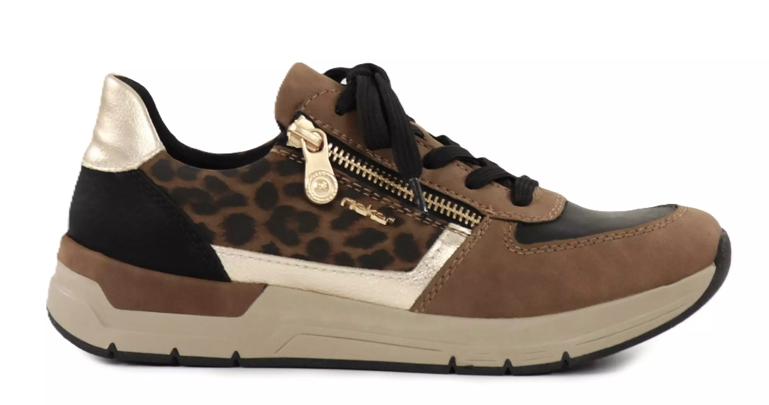 Stylische braune Rieker Sneaker erhalten eine persönliche Note durch trendige Leoparden-Details. Der seitliche Reißverschluss ermöglicht ein schnelles Anziehen, während die Schnürsenkel für eine anpassbare Passform sorgen. Die herausnehmbaren Innensohlen bieten zusätzlichen Komfort und die Möglichkeit, eigene Einlagen zu verwenden. Eine lässige stilvolle Wahl für den Alltag!