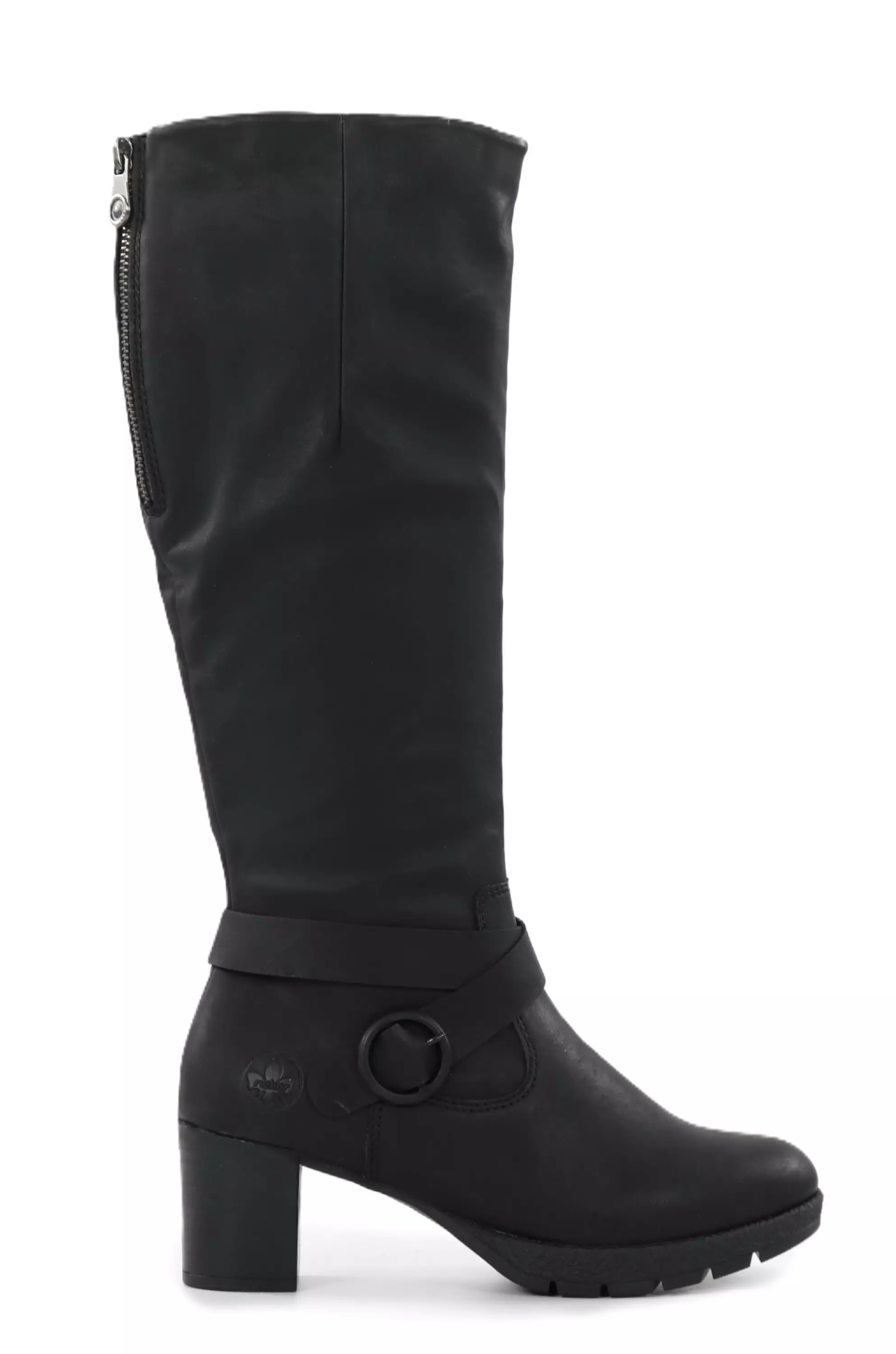 Stilvolle Rieker-Stiefel mit Blockabsatz und schmalem XS-Schafft. Das Gummiband, das unter dem Reißverschluss an der Rückseite des Schaftes sichtbar wird, bietet bei Bedarf zusätzlichen Platz und Flexibilität.