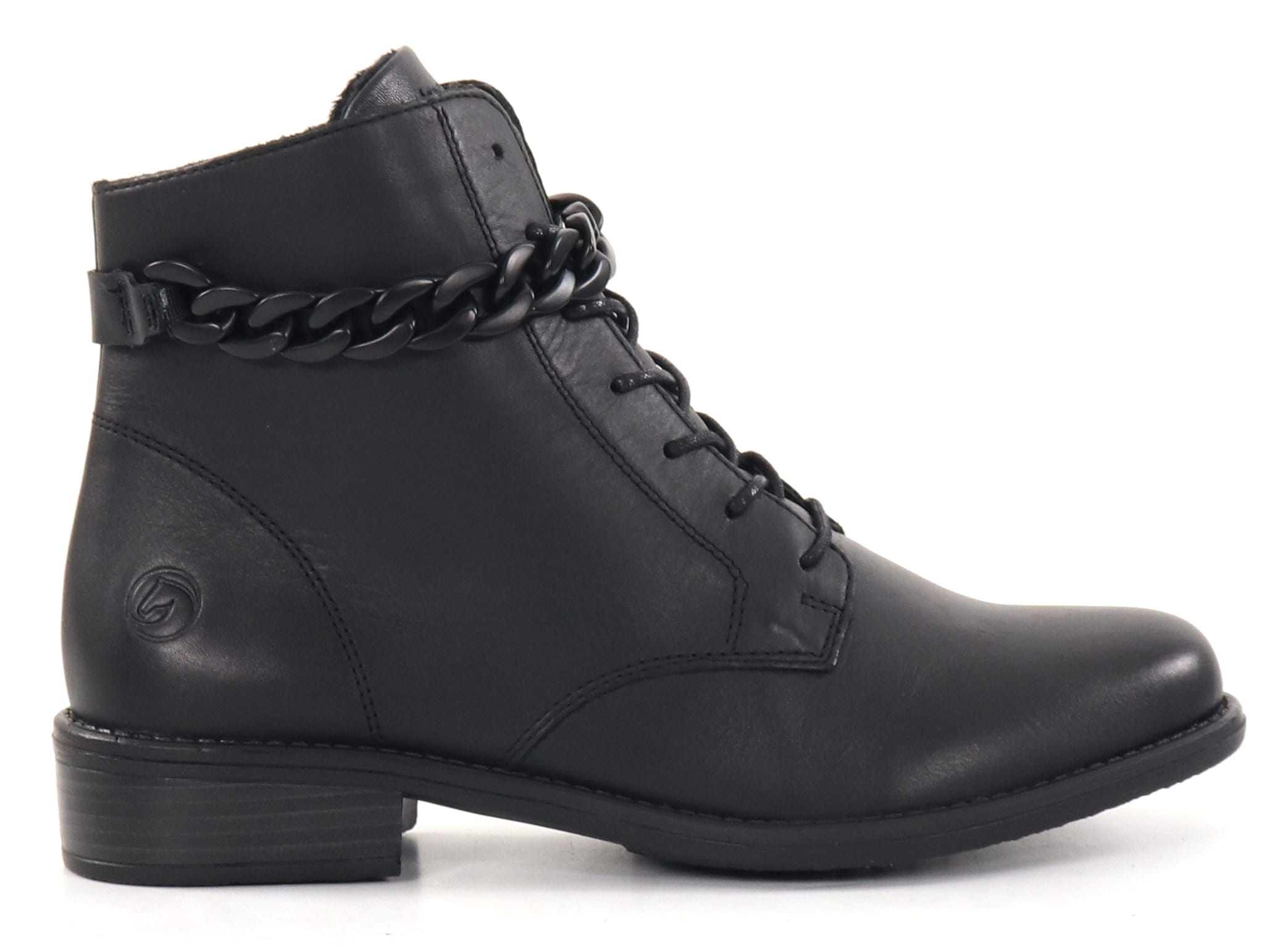 Stylische und vielseitige Leder-Stiefeletten mit herausnehmbarer Innensohle. Abnehmbare kettenartige Dekoration am oberen Schaft.
