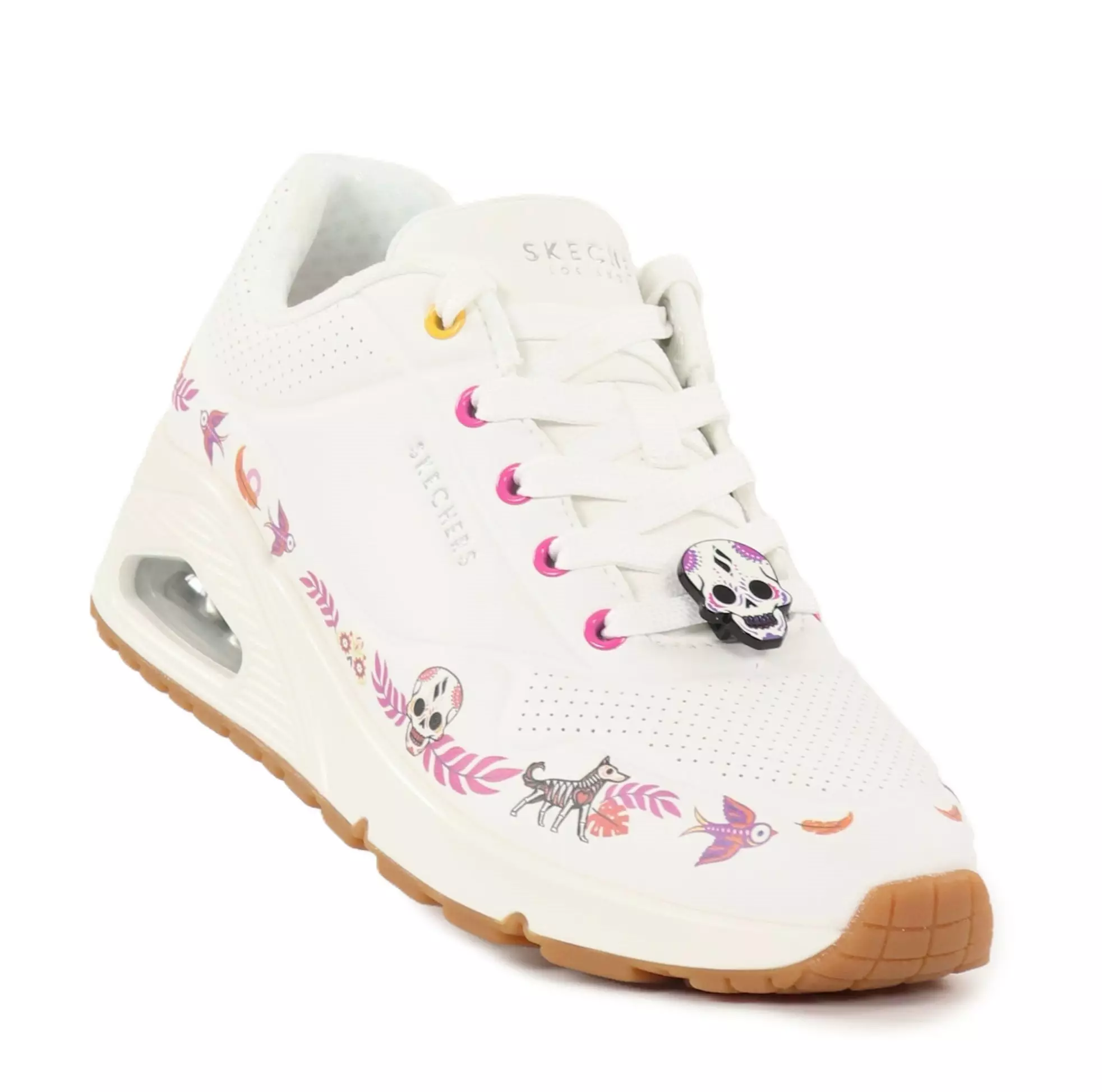 Diese Skechers Uno Sneakers vereinen Komfort und ein individuelles Design – die bunten Muster und die dekorative Schnürung mit einem auffälligen Totenkopf-Element machen sie zu einem echten Blickfang. Die Air Cooled Memory Foam Innensohle sorgt für ein atmungsaktives und weiches Tragegefühl, das den ganzen Tag anhält.