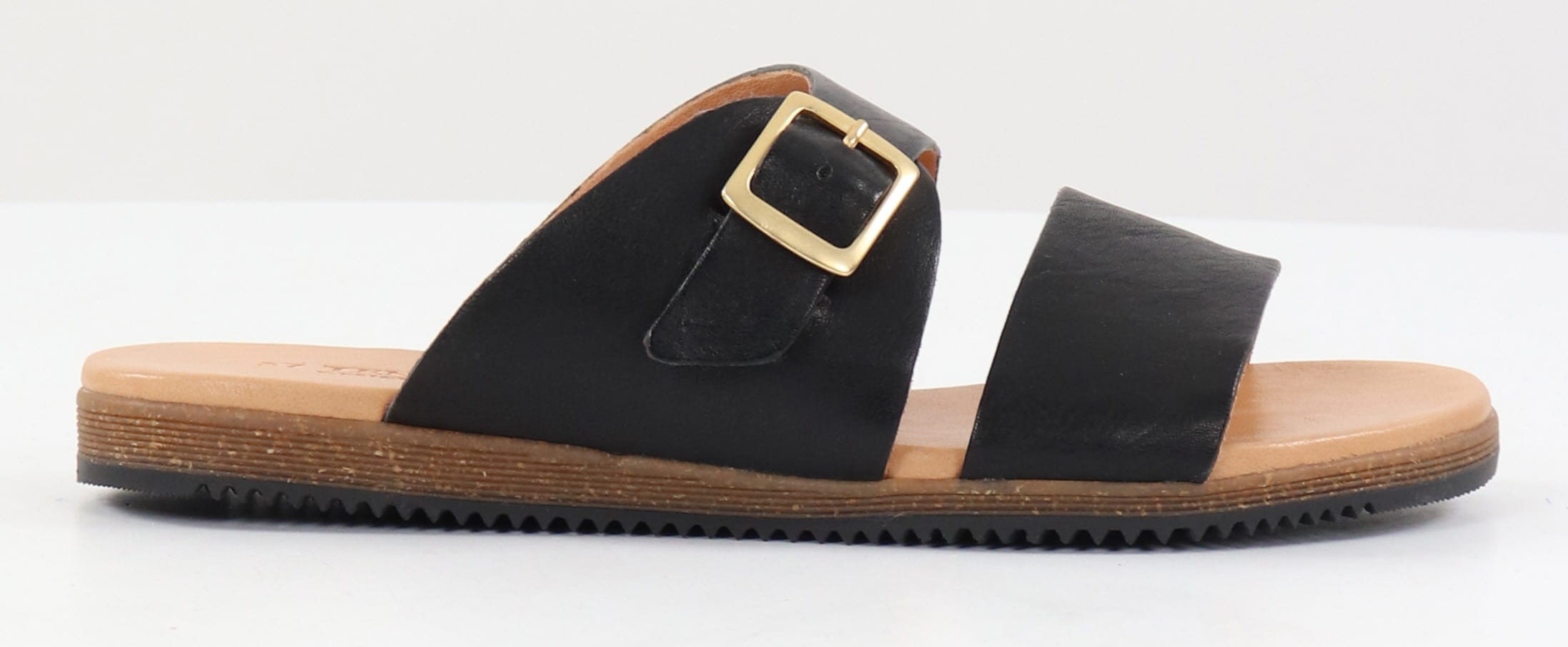 Schwarze Ledersandalen mit Schnallenverschluß.
