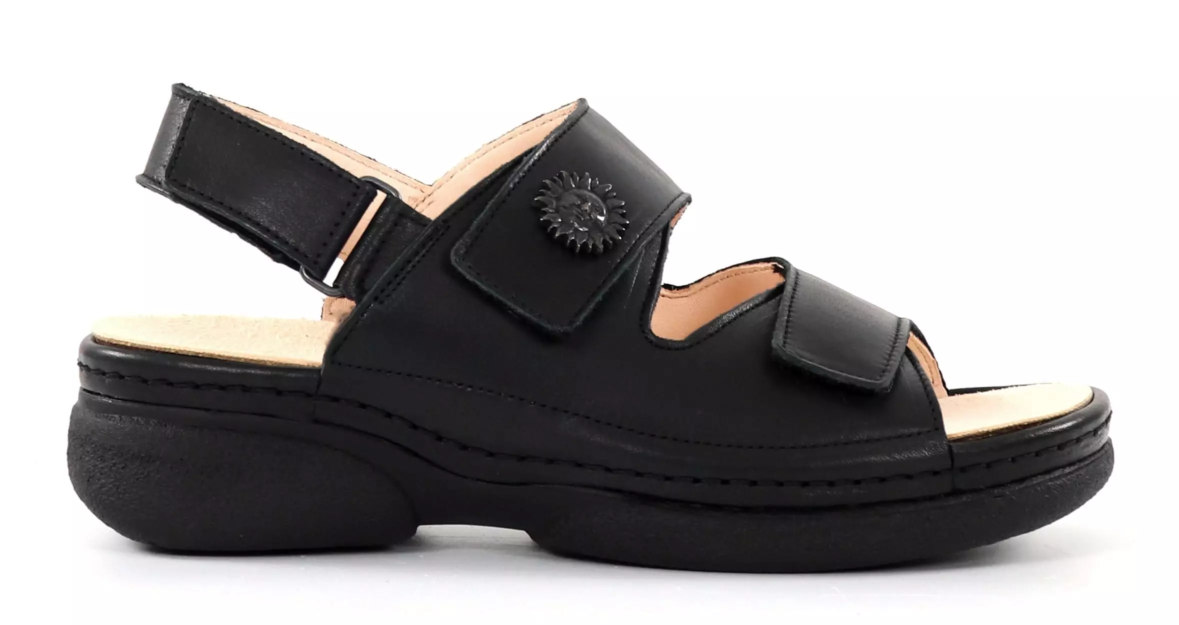 Elegante Arbeitsschuhe aus Aitonleder mit verstellbaren Klettbändern und herausnehmbaren Einlegesohlen. Auf dem rechten Schuh befindet sich ein Sonnenemblem, auf dem linken ein Mond!