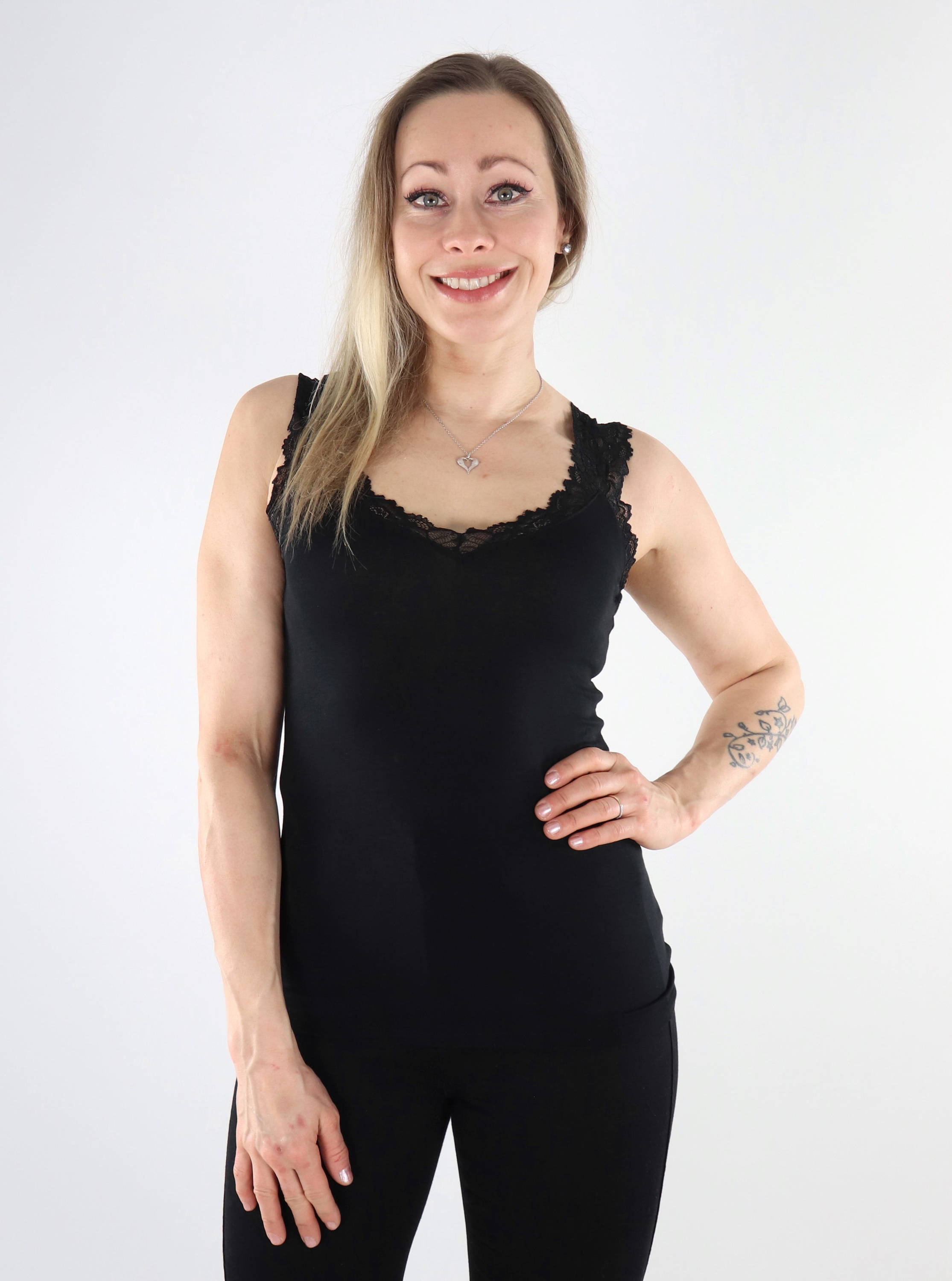Elastisches Top mit Spitzenträgern.