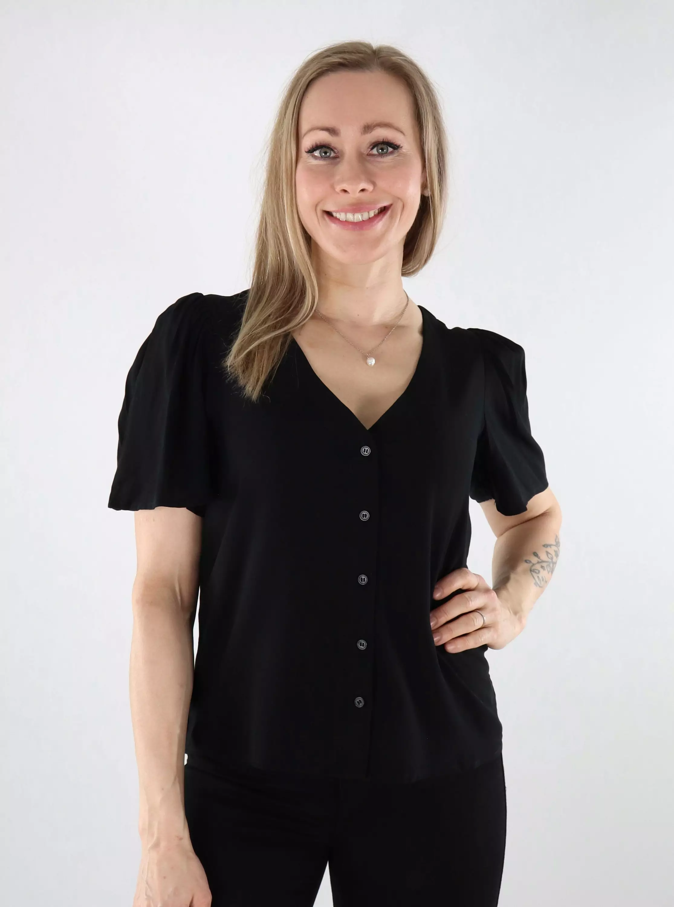 Leichtes T-Shirt mit Knopfleiste und femininen Flügelärmeln. Das T-Shirt ist aus verantwortungsvoll produzierter LENZING ECOVERO-Viskose gefertigt.