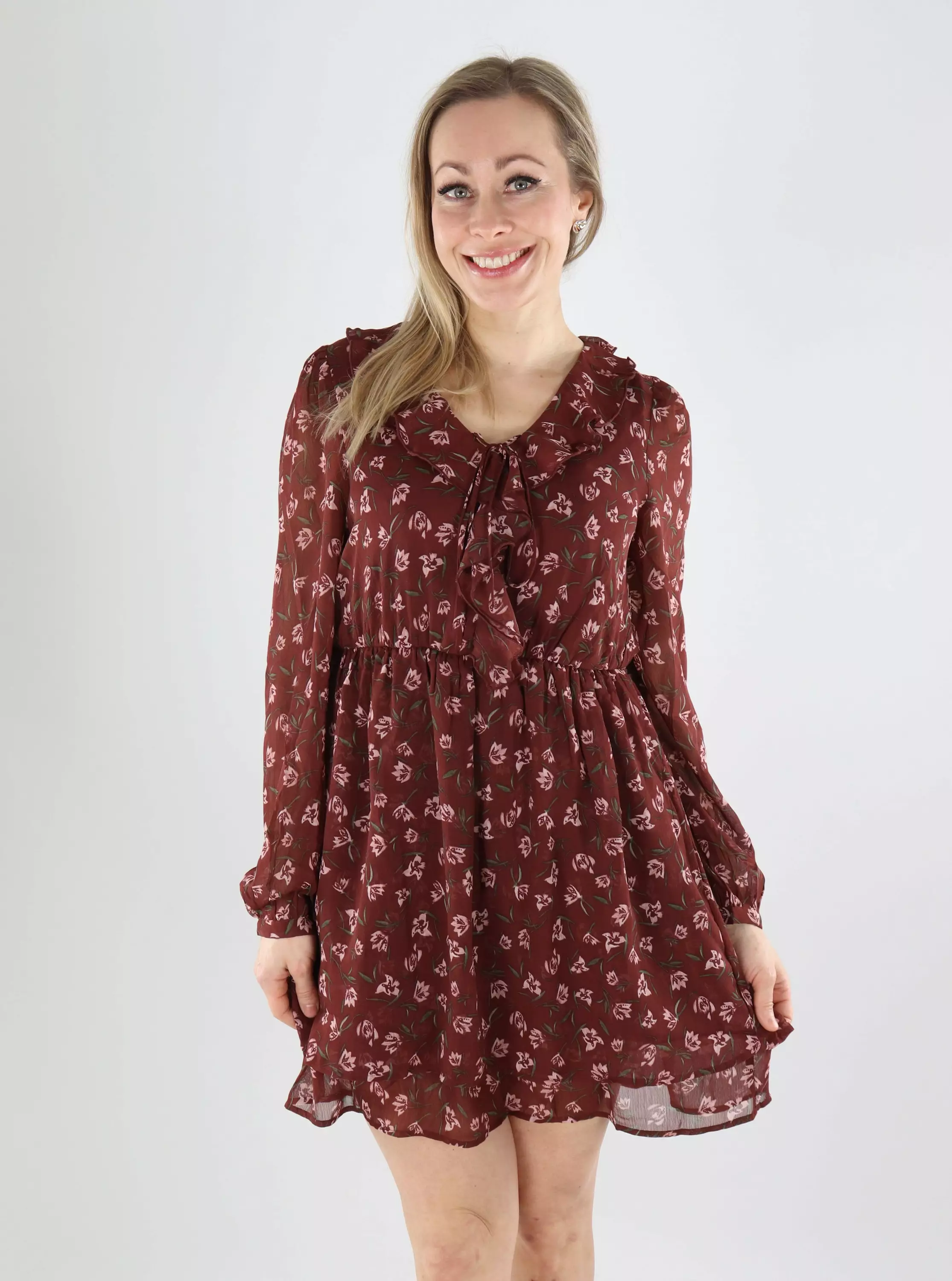 Leichtes und feminines Kleid von Vero Moda. Das Kleid verfügt über einen schmeichelhaften V-Ausschnitt und schöne Rüschendetails sowie ein elastisches Band im Rückenbereich für zusätzlichen Komfort.