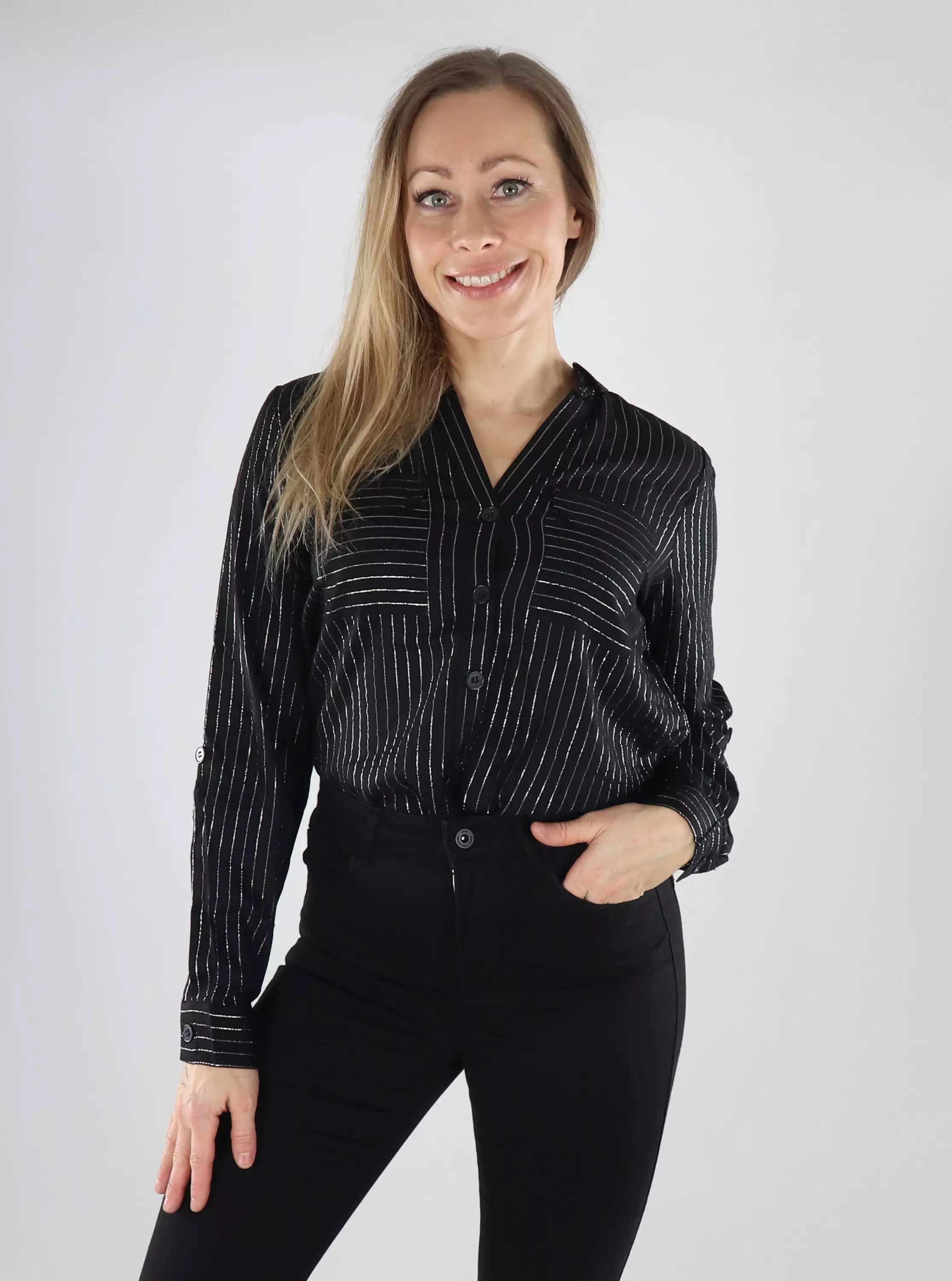 Stilvolle Bluse mit schimmernden Streifen! Der abgerundete Saum und der längere Schnitt hinten schaffen eine elegante Silhouette. Die umschlagbaren Ärmel bieten Vielseitigkeit und die Möglichkeit, den Look einfach zu verändern.