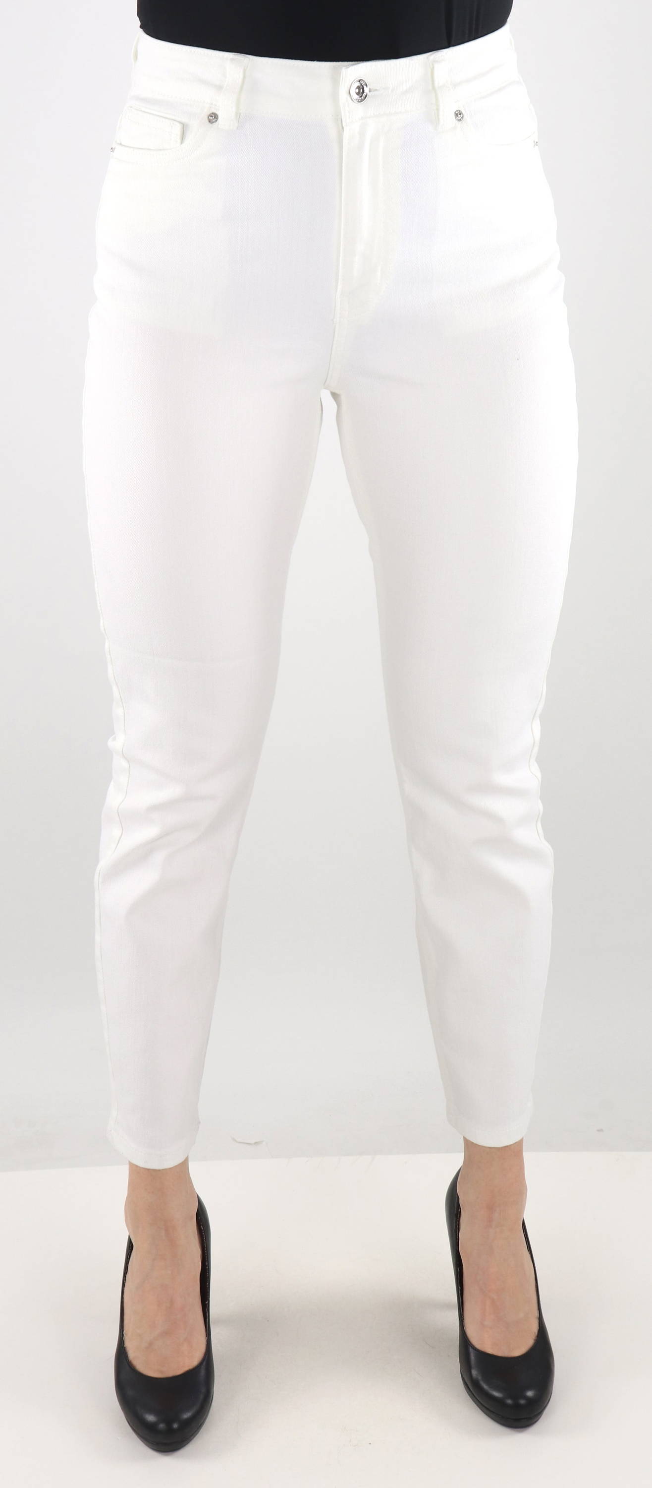 Die Farbe der Jeans ist weiß, sodass Sie mehrere Outfits kombinieren können - in unserem Onlineshop. Es gibt mehrere Optionen, zum Beispiel können Sie ein schwarzes Blazer-Outfit mit roten Absätzen kombinieren. Sie finden alles, was Sie benötigen, im Onlineshop Stilettoshop.eu
