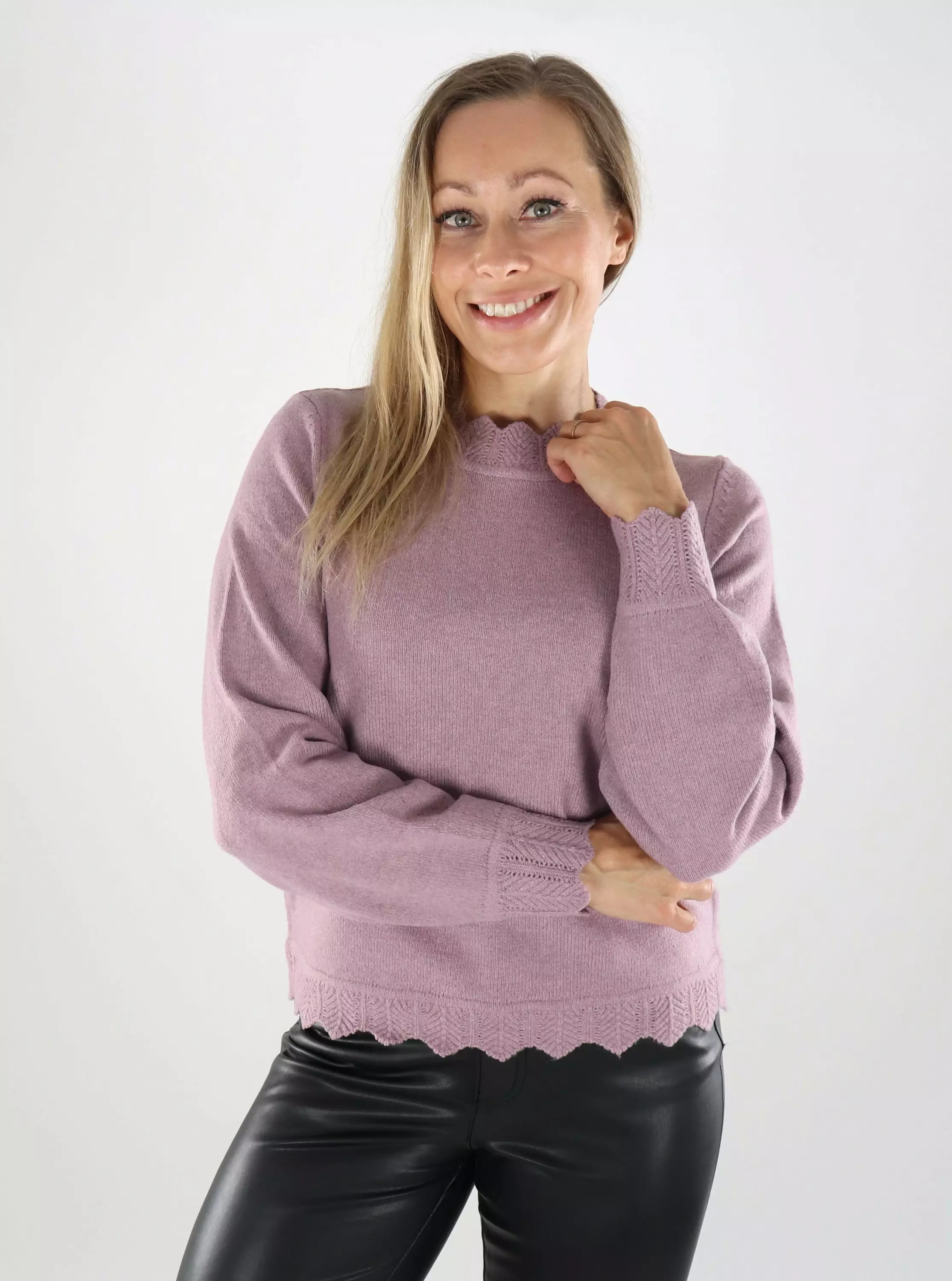 Weicher und stilvoller Pullover mit beeindruckenden gemusterten Strickbündchen als Blickfang. Eine dezent auffällige Wahl für den Alltag oder das Büro!