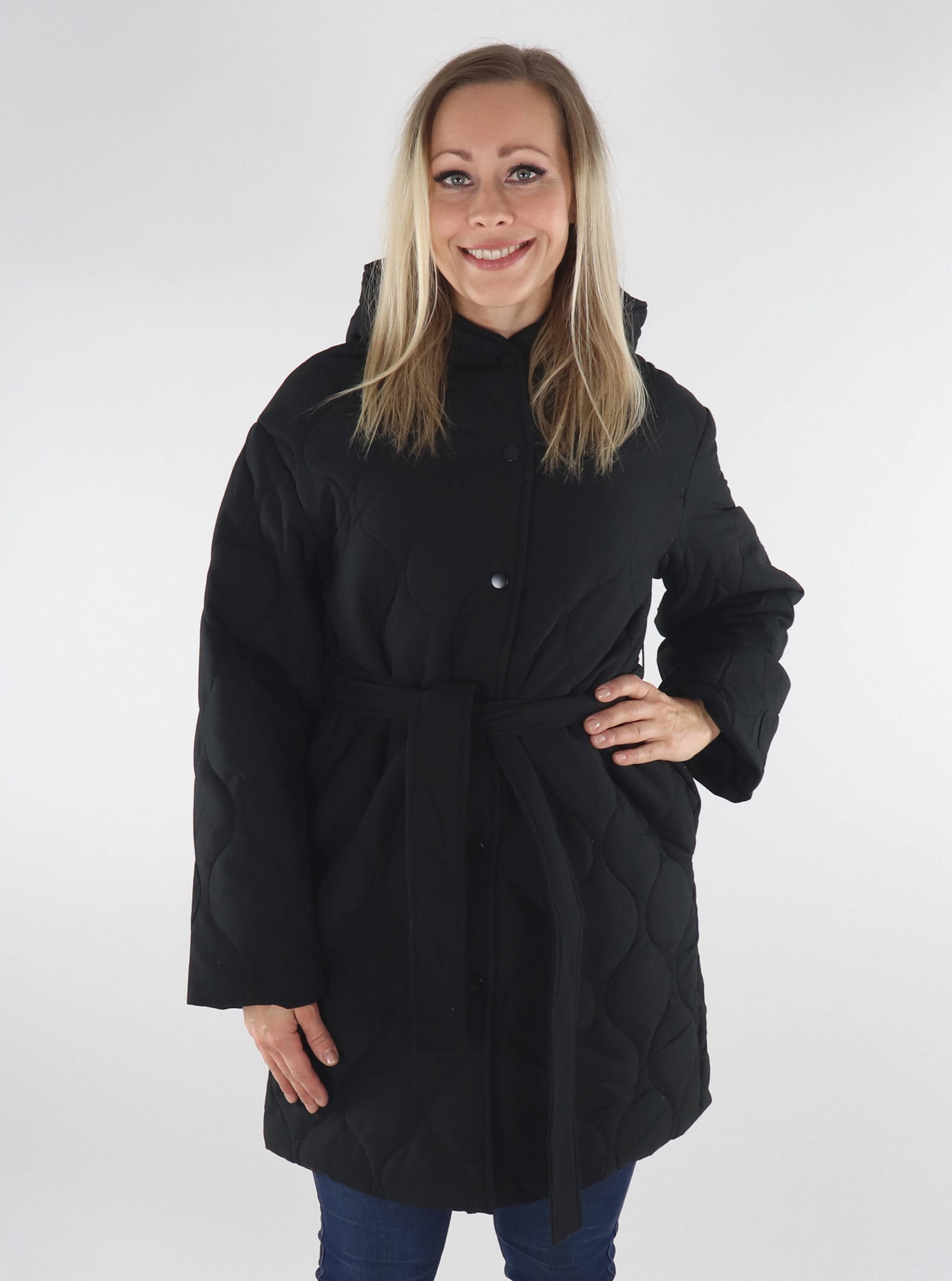 Steppmantel mit Kapuze und abnehmbarem Stoffgürtel.